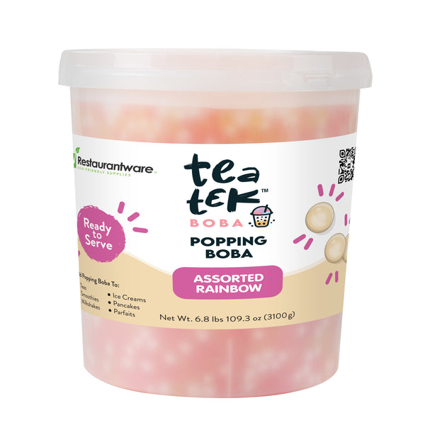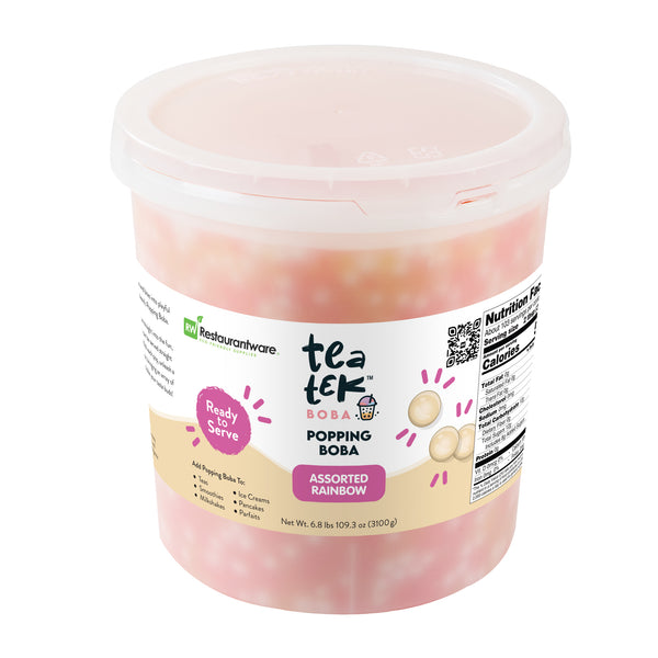Elevate your culinary creations with our Tea Tek 6.8-pound Assorted Rainbow Popping Boba. These delightful popping pearls add a burst of color and fun to any drink or dessert, instantly making them stand out. Packaged in a hassle-free resealable jar, these popping boba ensure freshness and extend shelf life for your convenience. Enjoy the versatility and deliciousness of these popping boba, making every bite a delightful experience. Transform your beverages with these rainbow boba pearls, bringing a creative and trendy twist to your menu. Each boba jar offer a substantial capacity of 6.8 pounds. Sold in a 4 count box.