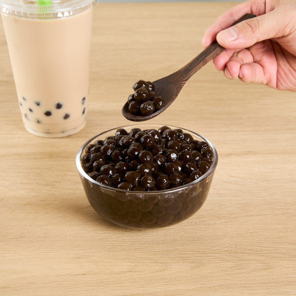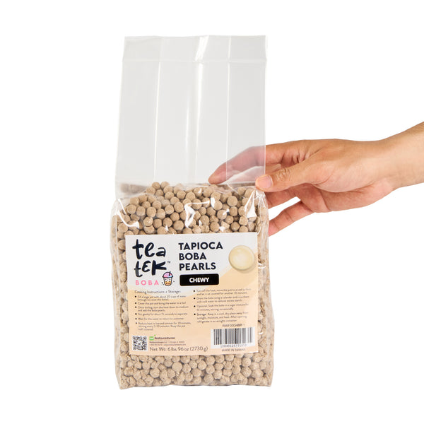Enhance your menu with versatile and authentic boba options. Tea Tek Chewy Texture Boba Pearls deliver a traditional mouthfeel that bubble tea enthusiasts crave, ensuring your drinks stand out. These 6-pound bulk packages are perfect for high-volume establishments, providing a consistent supply of boba pearls and minimizing reordering frequency. The chewy boba pearls can be simmered for 30 minutes to guarantee their signature texture, while soaking them in a sugar mixture enhances flavor retention, making them ideal for diverse culinary applications. With a dimension of 15.3 inches in height, these edible brown pearls are perfect for bubble tea tapioca offerings and can be held for up to 6 hours to ensure freshness during extended service periods. Diversify your menu with these delicious additions and attract more customers with your innovative drinks. Each order includes 1 Tea Tek Chewy Texture Boba Pearls.