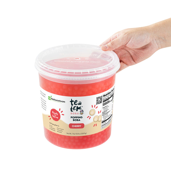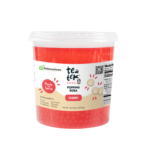 Transform your drinks and desserts with our Tea Tek 7-pound Cherry Popping Boba. These popping pearls require no cooking, making them easy to add to any dish. Packaged in a hassle-free resealable jar, these cherry popping boba ensures freshness and extends shelf life. Enjoy the convenience of vegan, with no gluten or dairy popping boba in every bite. These popping pearls will elevate your culinary creations, making them look more creative and trendy. Each cherry boba jar offer a substantial capacity of 7 pounds. Sold in a 4 count box.