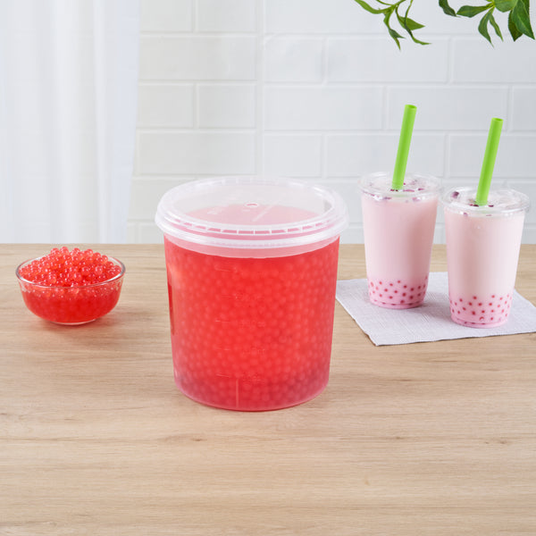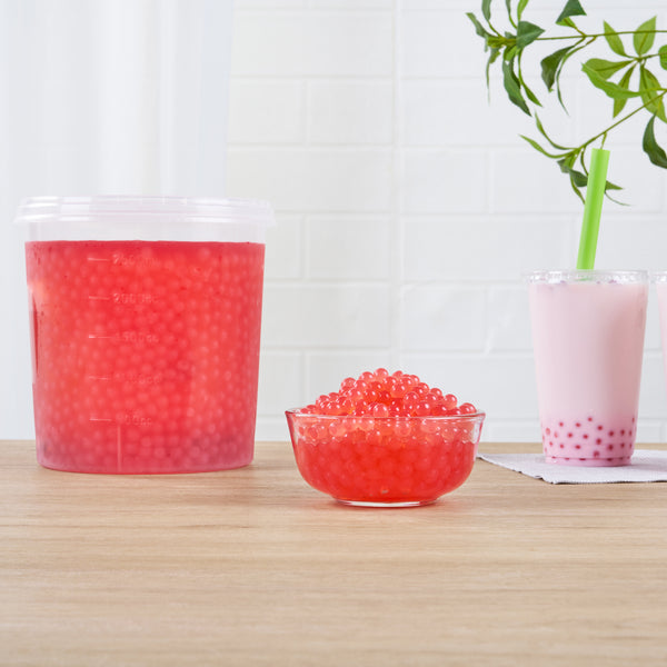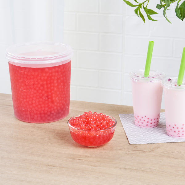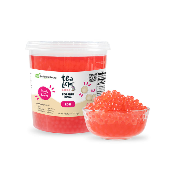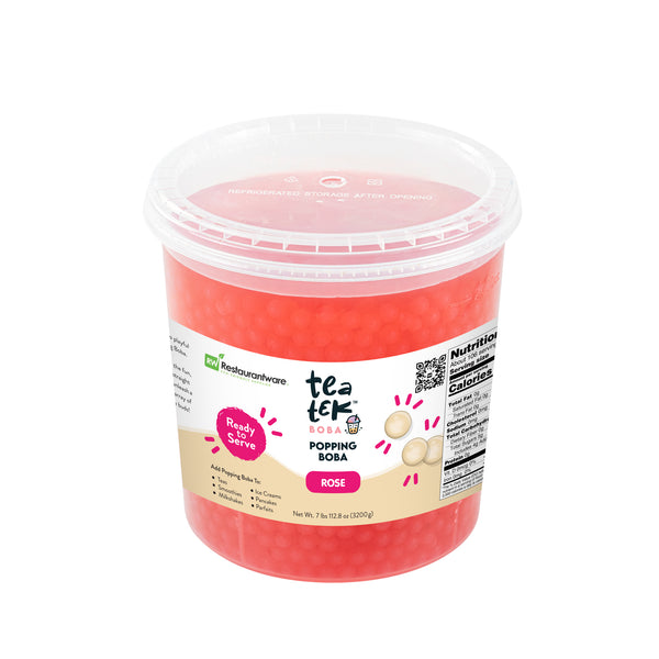 Elevate your beverages and desserts with our Tea Tek 7-pound Popping Boba in rose flavor. Ensuring maximum freshness and extended shelf life, these popping boba are packaged in a resealable jar. There is no cooking required to use these popping pearls adding convenience to any kitchen. Enhance your culinary creations with the burst of texture and rich rose flavor provided by these popping boba. These delightful popping pearls add a creative and trendy touch to any drink or dessert. Each jar contains 7-pound, and the dimensions are 7.19 inches in diameter by 7.87 inches in height. Sold in a 4 count box.