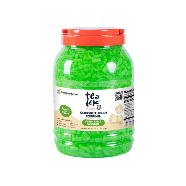 Introducing our Tea Tek 8.8-pound Jelly Toppings in green apple coconut flavor, a delectable addition to any beverage or dessert. There is no cooking required, you can simply scoop, rinse, and enjoy this delicious jelly topping. These boba jelly toppings infuse a burst of flavor and texture into your bubble tea, slushies, smoothies, shaved ice, and more. Each jelly topping jar offer a substantial capacity of 8.8 pounds. Sold in a 4 count box.