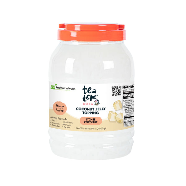 Introducing our Tea Tek 8.8-pound Jelly Toppings in lychee coconut flavor, the perfect addition to elevate your boba tea and dessert offerings.There is no cooking required, you can simply scoop, rinse, and enjoy this delicious jelly topping.These boba tea jelly toppings add an irresistible layer of taste and texture to any beverage or dessert. Ideal for a variety of beverages these jelly toppings enhance drinks like boba tea, mocktails, and smoothies. Each jelly topping jar offer a substantial capacity of 8.8 pounds. Sold in a 4 count box.
