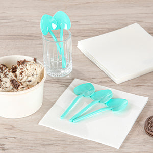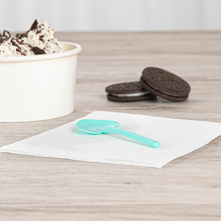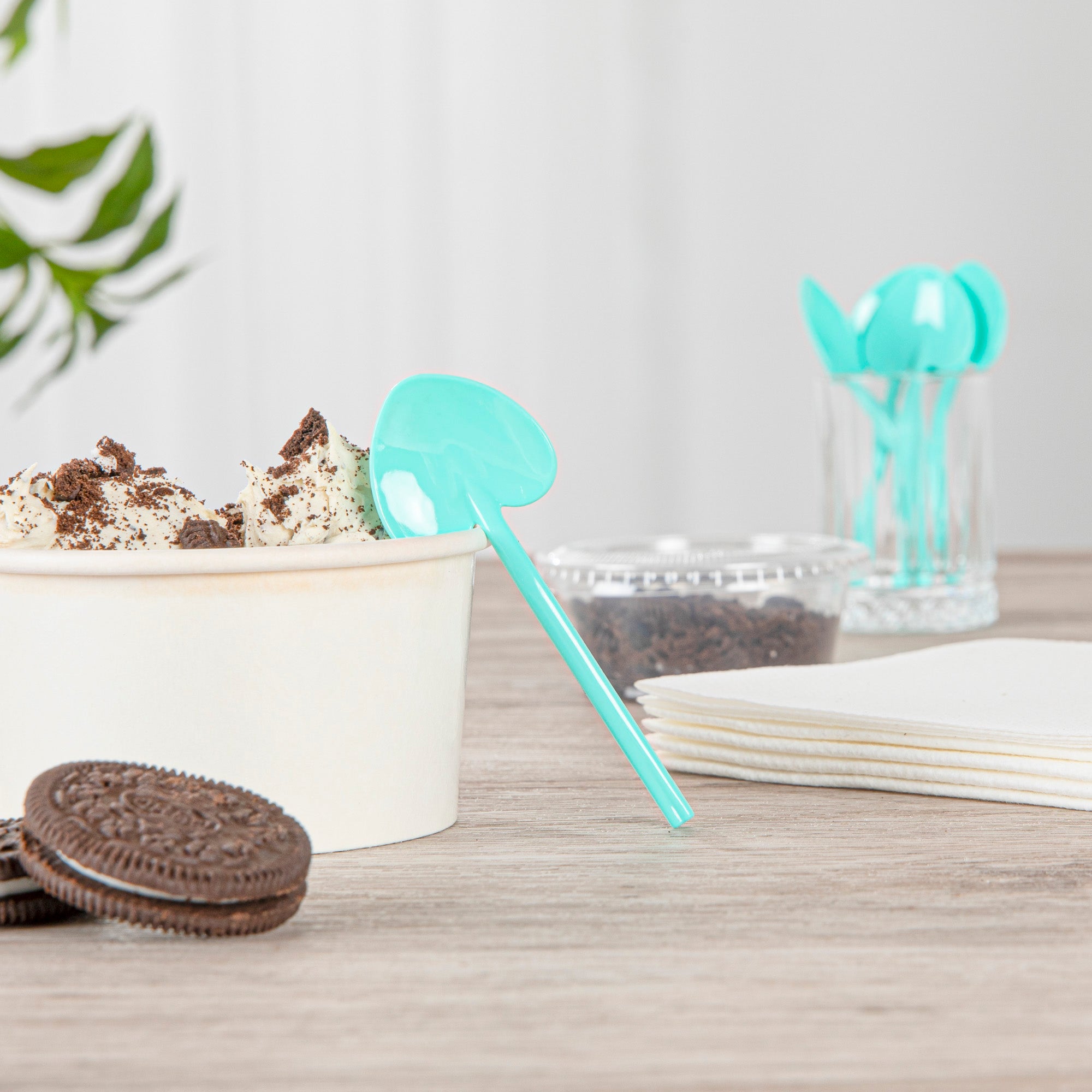 Devour freshly scooped gelatos with our Coppetta Teal Plastic Love Shovel Spoons. Featuring a heart-shaped shovel design, these recyclable plastic spoons will bring a playful touch to your delectable desserts. The ergonomic design of the handle of these mini dessert spoons ensures a comfortable and enjoyable grip for customers. With robust and durable construction, these disposable spoons effortlessly delve into generous bowls of desserts. Adorning a cheerful teal finish, these mini gelato spoons are sure to bring a whimsical touch to your ice cream parlor or fro-yo shop. Each of these mini spoons measures 3.5 inches in length by 1.25 inches in width. Sold in a 100 count box.
