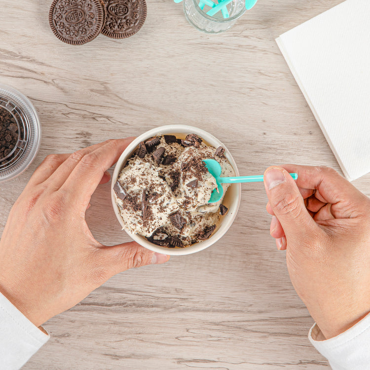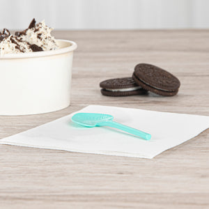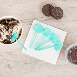 Devour freshly scooped gelatos with our Coppetta Teal Plastic Love Shovel Spoons. Featuring a heart-shaped shovel design, these recyclable plastic spoons will bring a playful touch to your delectable desserts. The ergonomic design of the handle of these mini dessert spoons ensures a comfortable and enjoyable grip for customers. With robust and durable construction, these disposable spoons effortlessly delve into generous bowls of desserts. Adorning a cheerful teal finish, these mini gelato spoons are sure to bring a whimsical touch to your ice cream parlor or fro-yo shop. Each of these mini spoons measures 3.5 inches in length by 1.25 inches in width. Sold in a 500 count box.