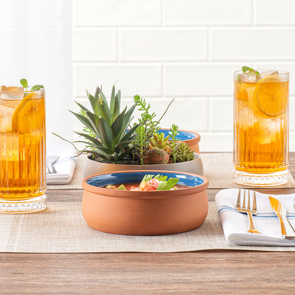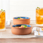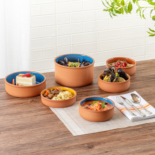 Enhance your restaurant's presentation with vibrant dishware. The Terra Tek Glazed Interior Terracotta Cazuela is designed with a stunning blue glazed interior, elevating the visual appeal of every meal served in this terracotta cazuela. Its dishwashable design enables quick cleanup, significantly reducing labor costs and increasing operational efficiency. Crafted from durable terracotta, this cazuela withstands high temperatures, making it ideal for versatile use from oven to freezer, and ensuring longevity in commercial settings. With a generous 17-ounce capacity and a 5.75-inch diameter, it provides ample space for a variety of dishes, from tapas to individual desserts, making it the perfect tapas serving bowl. The combination of its durability, aesthetic appeal, and practicality makes it a must-have for any foodservice establishment looking to impress guests with presentation and efficiency. Each order includes 2 Terra Tek Glazed Interior Terracotta Cazuela.