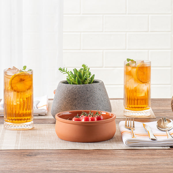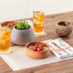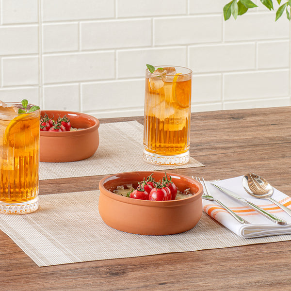 Experience the perfect blend of functionality and elegance with our Terra Tek 17-ounce Terracotta Cazuela Bowls. These recyclable cazuela bowls, crafted from durable terracotta, are designed to withstand the rigors of daily use and still retain their premium appearance. With their brown glazed interior, these greaseproof glazed bowls add a pop of color and sophistication to your food presentation. These cooking bowls are oven-ready and are perfect for baking and serving a variety of dishes, enhancing your kitchen's versatility. Plus, these microwave cooking bowls let you conveniently heat your meals, ensuring they are served at the perfect temperature every time. Freezable and dishwashable, these gourmet kitchen bowls simplify your food preparation and clean-up process, making them a must-have in any busy kitchen. These terracotta cazuelas have a generous capacity of 17 ounces, ideal for serving hearty portions of your culinary creations. Measuring 5.75 inches in diameter by 2 inches in height, these terracotta cazuela bowls are compact yet spacious, making them a practical choice for any foodservice establishment. Sold in a 2 count box.
