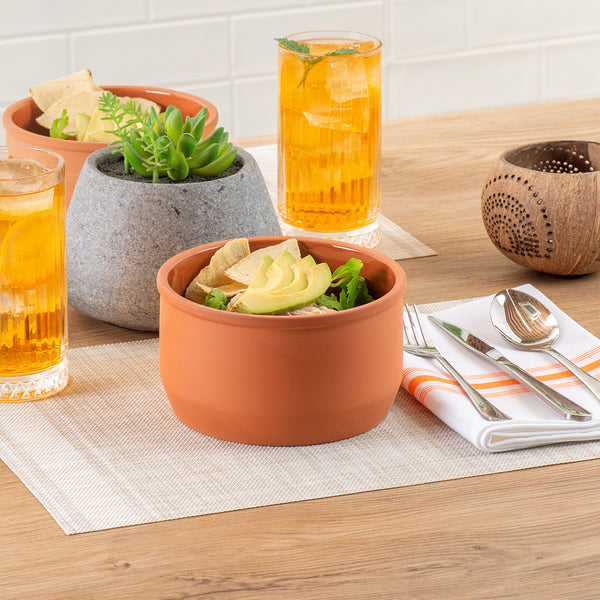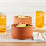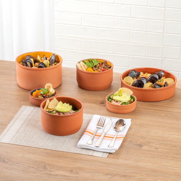 Introduce a touch of rustic elegance to your culinary creations with our Terra Tek 34-ounce Terracotta Cazuela Bowls. These cazuela bowls, made from durable terracotta, ensure longevity and reliability in even the busiest of kitchens. With a unique brown glazed interior, these greaseproof glazed bowls not only provide a beautiful contrast to your food but also ensure easy clean-up. These cooking bowls are oven-ready, making them the perfect companion for your oven-baked recipes. Plus, these microwave cooking bowls can be used to reheat your meals without compromising the flavor or texture. For those who love to prep in advance, these recyclable cazuela bowls can be securely stored in the freezer, making them a versatile addition to any gourmet kitchen. With a capacity of 34 ounces, these reusable terracotta bowls are perfect for serving main courses or family-sized salads. Measuring 6.25 inches in diameter by 3.5 inches in height, these terracotta cazuelas are just the right size for your serving needs. Sold in a 2 count box.