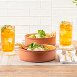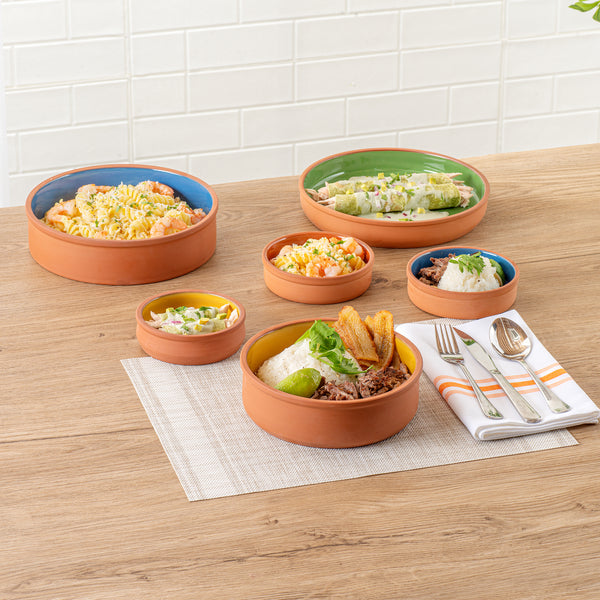 Elevate your culinary creations with our Terra Tek 34-ounce Terracotta Cazuela Bowls. Crafted from durable terracotta, these recyclable cazuela bowls ensure long-lasting use and withstand frequent handling in busy kitchens. Showcasing a striking yellow glazed interior, these terracotta bowls add an attractive touch to your food presentations. Ideal for cooking and serving, these glazed cooking bowls are oven-ready, allowing you to prepare delicious meals with ease.These microwavable terracotta bowls are perfect for quickly reheating dishes without sacrificing taste or quality. Plus, these greaseproof gourmet kitchen bowls are also freezable and dishwashable for ultimate convenience. Holds up to 34 ounces and measuring 7.5 inches in diameter by 2.25 inches in height, these glazed terracotta cazuelas are perfect for serving hearty meals. Sold in a 2 count box.