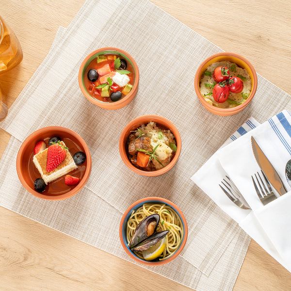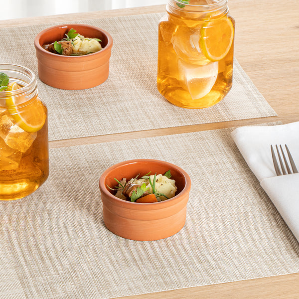 Transform your culinary presentations with our Terra Tek 5-ounce Terracotta Cazuela Bowls. These recyclable cazuela bowls, crafted from durable terracotta, are built to withstand high-temperature cooking and baking, making them a perfect addition to any gourmet kitchen. With their brown glazed interior, these greaseproof glazed bowls not only enhance the visual appeal of your dishes but also provide a smooth surface for cooking. Ideal for a variety of dishes, these cooking bowls are uniquely versatile, from baking bread to serving a hot bowl of soup. Plus, these microwave cooking bowls can transition seamlessly from oven to table to freezer, simplifying your kitchen processes. Plus, these reusable bowls are dishwashable, making clean-up a breeze and providing a more efficient kitchen workflow. With a capacity of 5 ounces and measuring 3.25 inches in diameter by 1.5 inches in height, these terracotta cazuelas are the perfect size for individual servings, enhancing portion control and reducing food waste. Sold in a 2 count box.