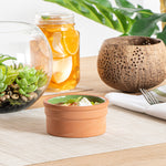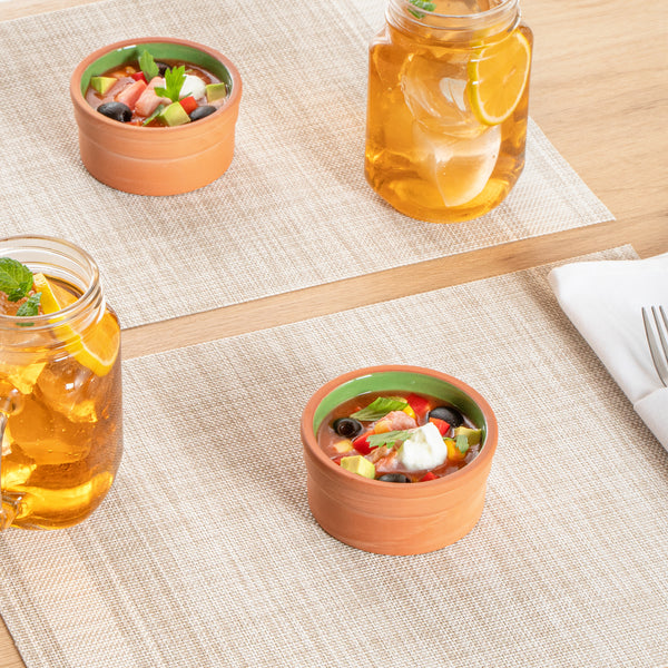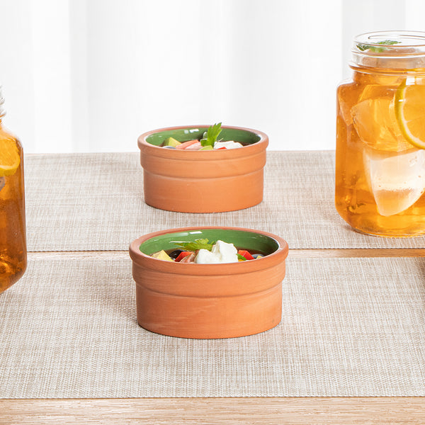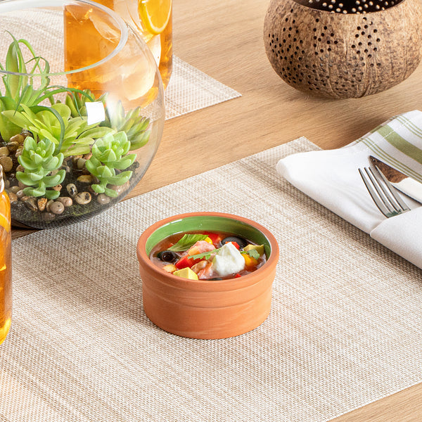 Streamline meal presentation with our Terra Tek Glazed Interior Round Terracotta Bowl. This 3.7-inch round terracotta bowl features a green glazed interior that enhances meal presentation, making dishes visually appealing for diners. Its dishwashable design enables effortless post-meal cleaning, saving time and effort for busy foodservice professionals. Constructed from premium terracotta, this cazuela bowl ensures durability and withstands high temperatures, ideal for versatile oven and microwave use. The compact size fits perfectly on serving trays, optimizing space in bustling kitchens. Use it as a terracotta serving dish to present tapas or desserts elegantly. With its ability to accommodate both hot and cold foods, this bowl is perfect for a variety of dining scenarios, from restaurants to catering events. Elevate your culinary creations with ease and efficiency. Each order includes 2 Terra Tek Glazed Interior Round Terracotta Bowls.