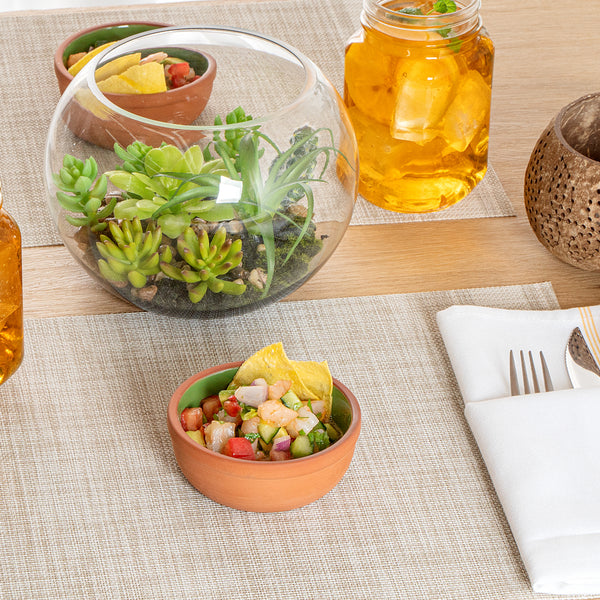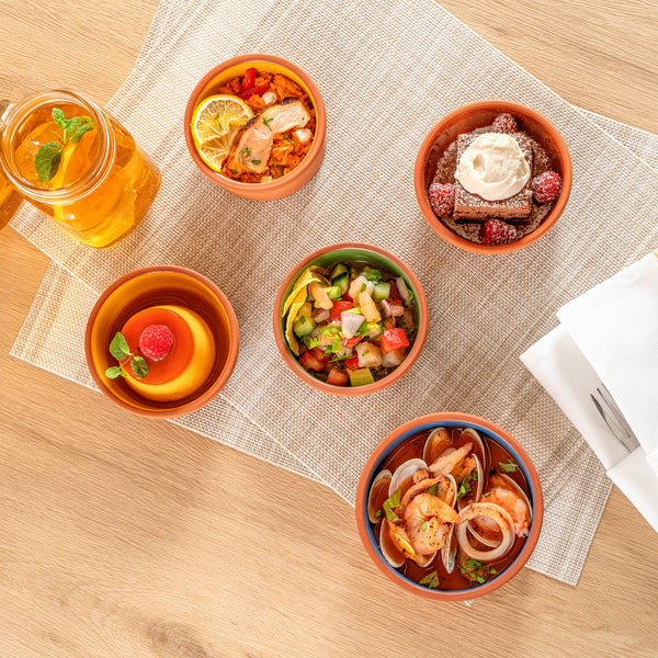 Experience the Mediterranean charm with our Terra Tek 5-ounce Terracotta Cazuela Bowls. These cazuela bowls, crafted from durable terracotta, offer a rustic yet timeless appeal that enhances your food presentation. The striking green glazed interior not only adds a pop of color but also makes these cooking bowls visually stunning. Ideal for a variety of dishes, these microwave cooking bowls can go straight from the oven to the table, offering true convenience. To ease your worries about cleaning, these greaseproof glazed bowls are dishwashable, ensuring effortless cleanup. For those who love meal prepping, these terracotta cazuelas are freezable, preserving your food's freshness until you're prepared to serve. With a generous capacity of 5 ounces and measuring 4 inches in diameter by 1.5 inches in height, these reusable glazed recyclable cazuela bowls are perfect for serving tapas or individual portions, allowing for easy storage. Sold in a 10 count box.