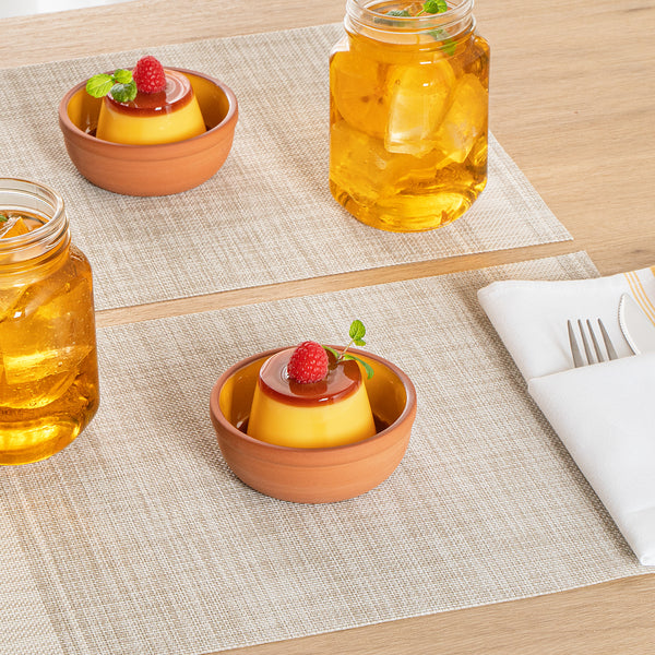 Elevate your culinary creations with our Terra Tek 5-ounce Terracotta Cazuela Bowls. Crafted from durable terracotta, these recyclable cazuela bowls are designed to withstand wear and tear, ensuring long-lasting use in your restaurant or bakery. With a stunning yellow glazed interior, these greaseproof glazed bowls not only serve as functional cookware but also double as elegant serving dishes for any dining setting. These cooking bowls are oven-ready, allowing you to transition from preparation to presentation easily. For quick meal preparations or reheating leftovers, these microwave cooking bowls provide the convenience of rapid heating. To add to their versatility, these gourmet kitchen bowls are also freezable, making them ideal for storing and preserving food. Easy to clean, these terracotta cazuelas are dishwashable, saving you time and effort in kitchen cleanup. Measuring 4 inches in diameter by 1.5 inches in height, these 5-ounce bowls have just the right capacity for serving individual portions, ensuring you deliver the perfect serving every time. Sold in a 10 count box.
