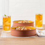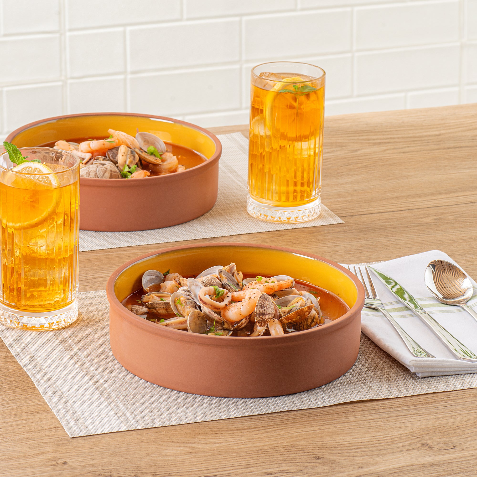Upgrade your culinary creations with our Terra Tek 51-ounce Terracotta Cazuela Bowls. Expertly crafted from durable terracotta, these recyclable cazuela bowls are designed to withstand high temperatures and can be used in the oven for various types of recipes. Showcasing a stunning yellow glazed interior, these terracotta bowls are add an elegant touch to your food presentation. To easily cook and serve your signature dishes in style, these greaseproof glazed bowls are oven-ready, allowing for convenient and efficient meal preparation. These oven-ready cooking bowls can also be stored in the freezer and are dishwashable for easy cleaning. Containing up to 51 ounces and measuring 9 inches in diameter by 2.25 inches in height, these terracotta cazuelas are perfect for serving large portions. Sold in a 2 count box.