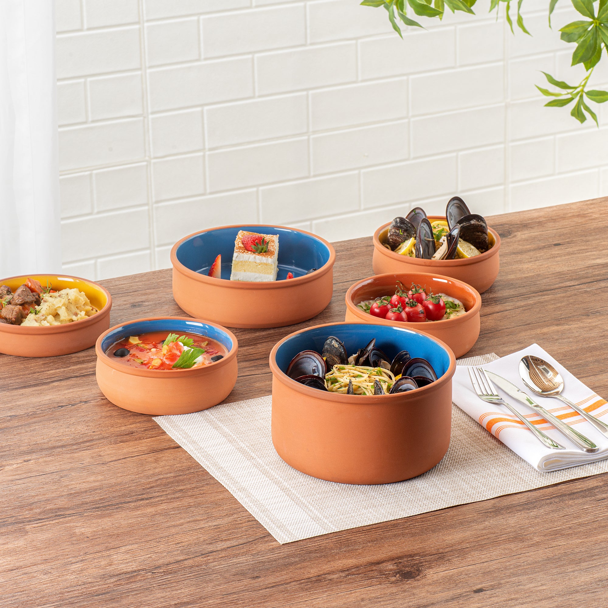 Discover the rustic charm and functionality of our Terra Tek 68-ounce Terracotta Cazuela Bowls. These cazuela bowls, handcrafted from durable terracotta, provide an authentic touch to your cooking and presentation. Show off your gourmet dishes with the vibrant blue glazed interior, which adds a pop of color to the food presentation. Ideal for a variety of dishes, these terracotta cazuelas are oven-ready, enabling you to go from stovetop to table with ease. These cooking bowls are microwavable, ensuring your food is evenly heated. Plus, these freezable cooking bowls protect your food for later use. For busy kitchens, these greaseproof glazed bowls are conveniently dishwashable, making cleanup quick and efficient. These gourmet kitchen bowls hold 68 ounces, allowing you to serve generous portions to your guests. Measuring 7.5 inches in diameter by 4 inches in height, these recyclable cazuela bowls offer ample space without sacrificing style. Sold in a 10 count box.
