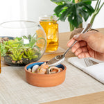 Ensure seamless kitchen-to-table service with our Terra Tek Blue Terracotta Cazuela Bowl. This terracotta bowl is crafted from premium terracotta, providing excellent heat retention to keep dishes warm throughout service. With a 4.75-inch by 1.6-inch dimension, it boasts a glazed interior that enhances presentation, making your meals visually appealing. As a versatile cazuela bowl, it's designed to be oven, microwave, and freezer safe, allowing you to prepare, store, and serve your creations without transferring contents into another dish. Perfect as a tapas serving dish, its 6.8-ounce capacity is ideal for individual portions of appetizers, sides, or desserts, adding an authentic touch to your culinary offerings. The dishwashable design simplifies cleaning, reducing labor costs and freeing up valuable time for your staff in busy commercial kitchens. Elevate your dining experience with this multifunctional tableware. Each order includes 2 Terra Tek Blue Terracotta Cazuela Bowls.