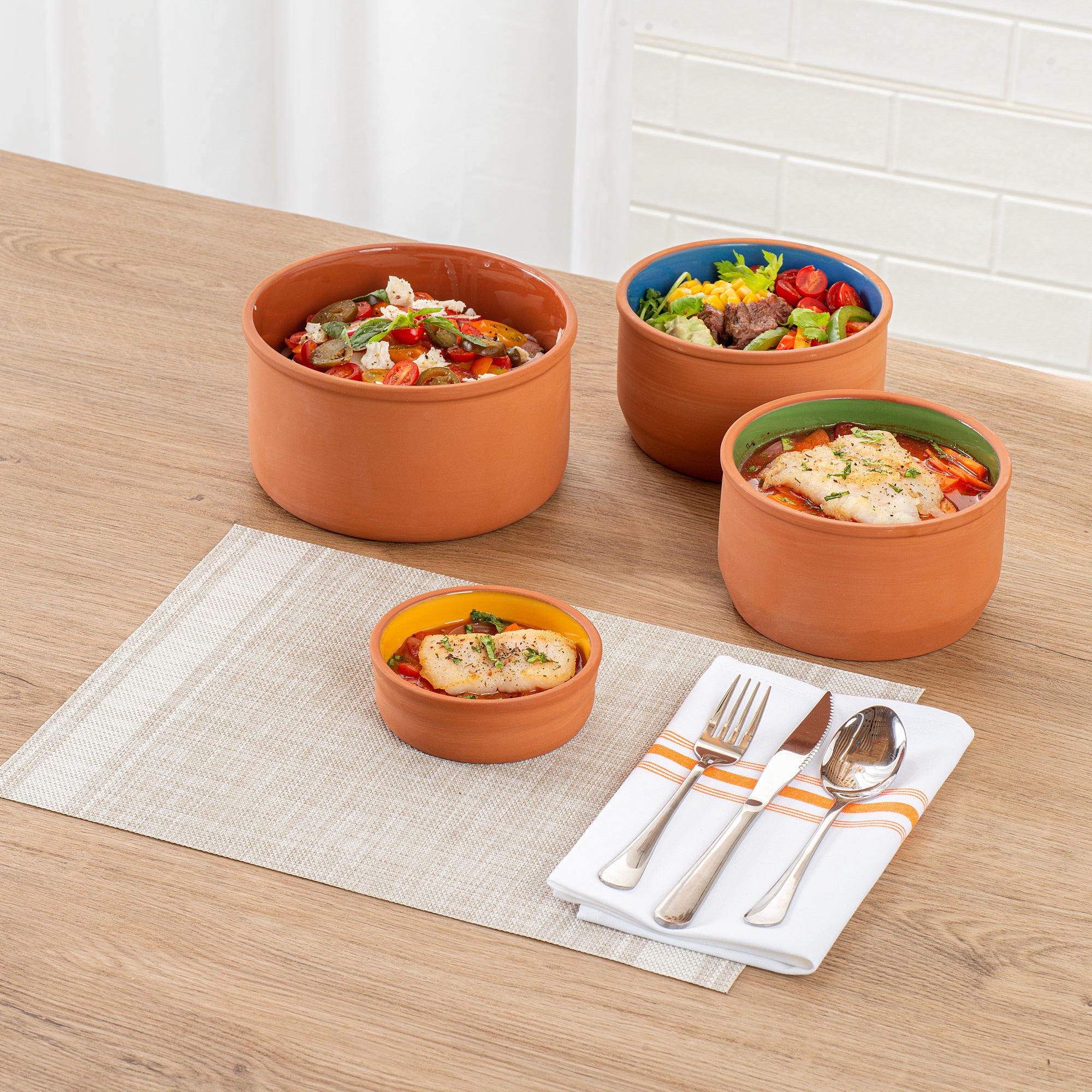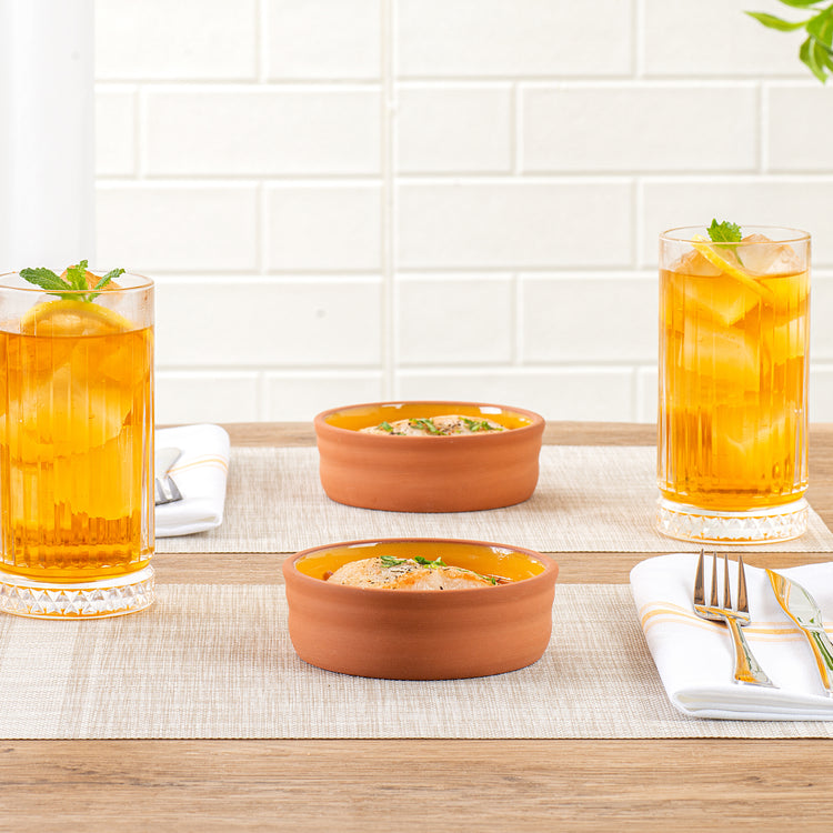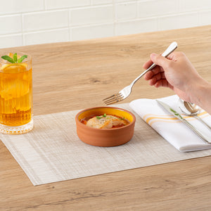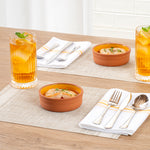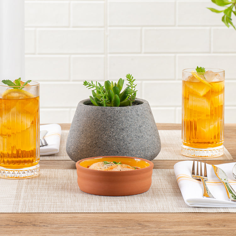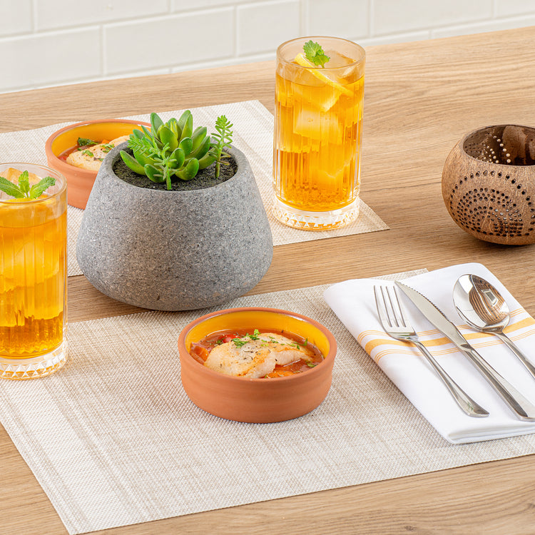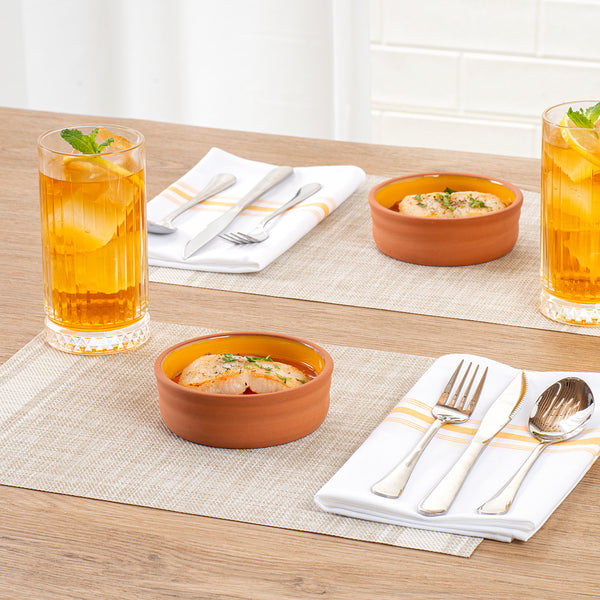 Enhance your dining experience with versatile and stylish serveware. The Terra Tek Glazed Cazuela Bowl showcases a vibrant yellow glazed interior that elevates food presentation, perfect for impressing guests with every dish. Crafted from premium terracotta, this cazuela bowl ensures excellent heat retention, keeping dishes warm and appetizing for longer periods. Its durable construction withstands daily use and is safe for ovens and microwaves, making it an ideal tapas serving bowl for busy kitchens. Measuring 4.75 inches in diameter, this bowl has a 6.8-ounce capacity, ideal for individual servings of Spanish delicacies or side dishes. The dishwasher-safe design simplifies cleanup, saving time and effort in bustling foodservice environments. Perfect for tapas restaurants and catering events, this spanish tapas bowl combines functionality with aesthetic appeal. Each order includes 2 Terra Tek Glazed Cazuela Bowls.