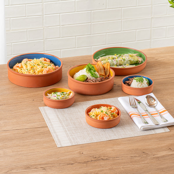 Introduce a touch of rustic elegance to your foodservice with our Terra Tek 9-ounce Terracotta Cazuela Bowls. Crafted from durable terracotta, these recyclable cazuela bowls are perfect for cooking and serving a variety of dishes. Boasting a beautiful brown glazed interior, these greaseproof glazed bowls instantly elevate the presentation of your culinary creations. Oven-ready and microwavable, these cooking bowls are designed for versatility, allowing seamless transitions from oven to table. Ideal for meal prep and storage, these cooking bowls are microwavable and freezable. For easy cleanup after a busy service, these gourmet kitchen bowls boast a dishwashable design. Holding up to 9 ounces and dimensions of 5 inches in diameter by 1 inches in height, these terracotta cazuelas are ideal for individual servings or appetizers. Sold in a 2 count box.