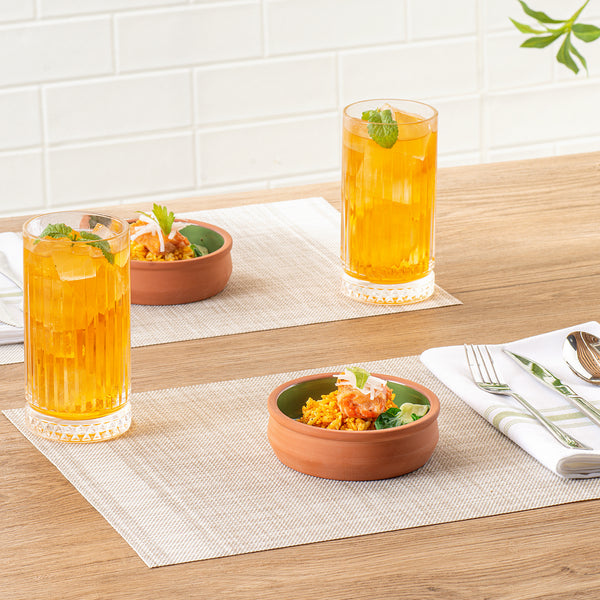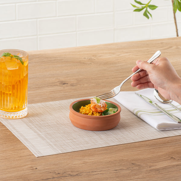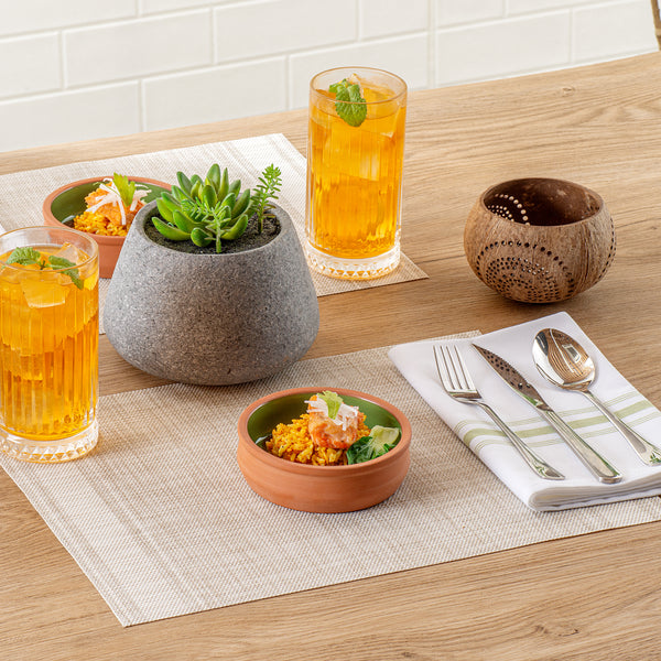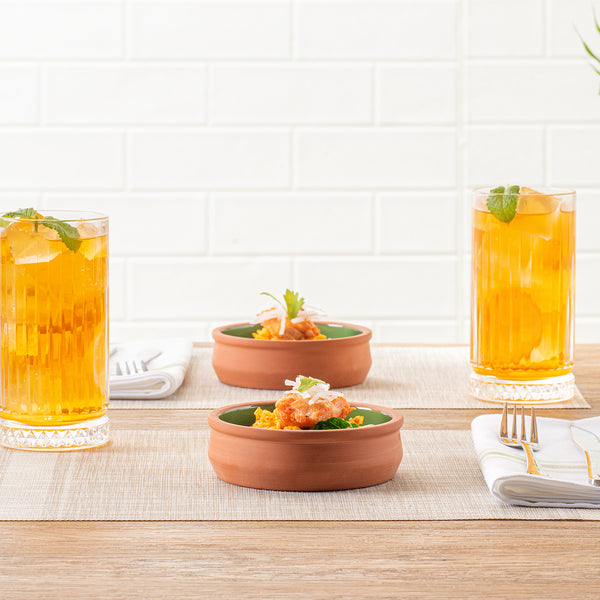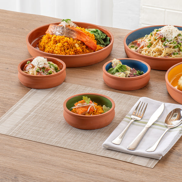 Immerse your customers in a traditional dining experience with our Terra Tek 9-ounce Terracotta Cazuela Bowls. These recyclable cazuela bowls, crafted from durable terracotta, offer enduring quality for heavy use. Showcasing a beautiful green glazed interior, these terracotta cazuelas add a vibrant pop of color to any culinary presentation. Ideal for a variety of dishes, these greaseproof glazed bowls are oven-ready, allowing you to seamlessly transition from cooking to serving. For heating food before serving, these cooking bowls are also microwavable, perfect for quick reheating or cooking. With the added benefit of being freezable, these microwave cooking bowls can securely store leftovers, reducing food waste and saving time on meal prep. Cleaning up is a breeze with these gourmet kitchen bowls, as they are dishwashable, making them an essential addition to any busy kitchen. With a generous capacity of 9 ounces, these terracotta cazuelas bowls can hold hearty portions of your signature dishes. Measuring 4.75 inches in diameter by 1.5 inches in height, these reusable cooking bowls are perfectly sized for individual servings, making them ideal for restaurants, caterers, and family dinners alike. Sold in a 2 count box.