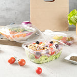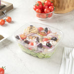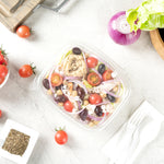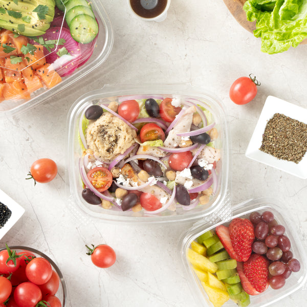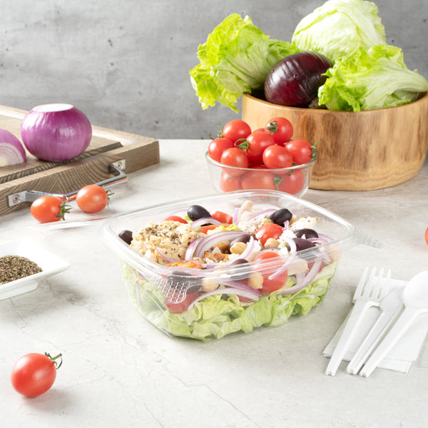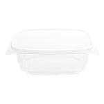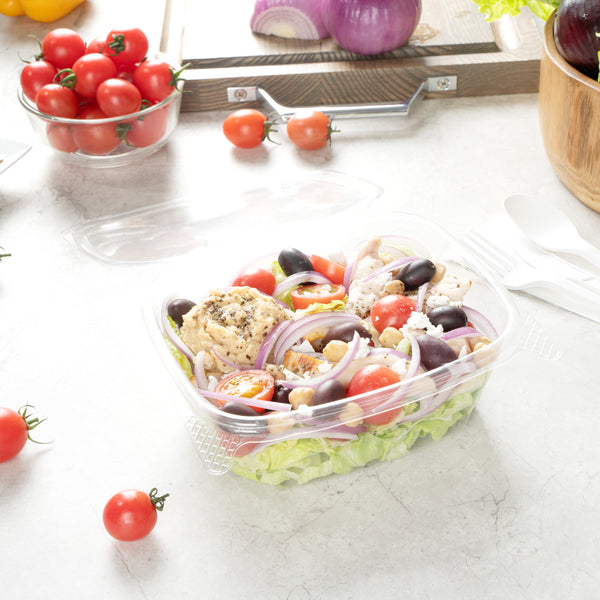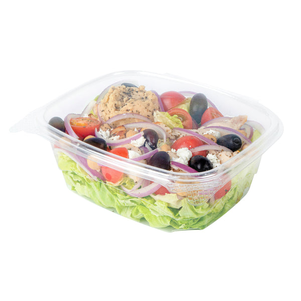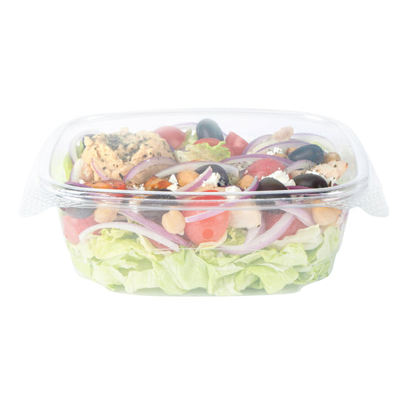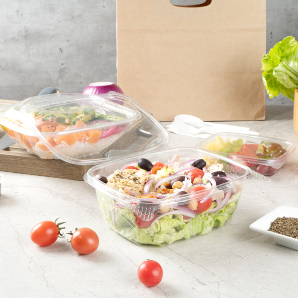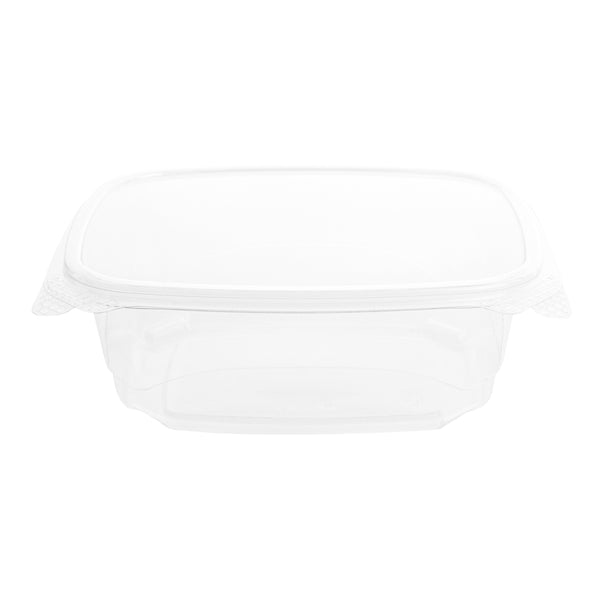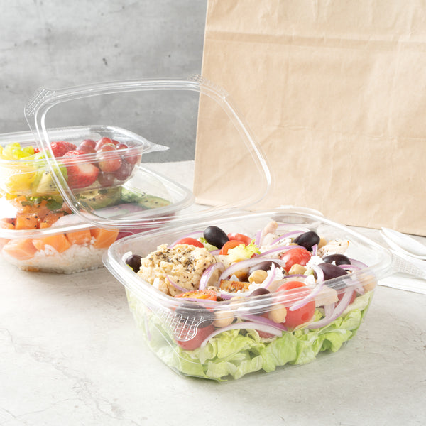 Use our Thermo Tek 32-ounce Rectangle Clear Plastic Deli / Snack Containers to cover your guests' meals. These plastic snack containers feature an anti-fog design to avoid condensation build-up and provide employees and customers with full visibility of packaged foods. Equipped with a hinged lid, these plastic food containers are perfect for securely packing patrons' to go orders. Designed with a transparent finish, these deli containers offer a clear view of dishes to avoid order mixups. To conveniently store prepped meals or leftovers, these plastic deli containers are freezable. Crafted from PET plastic, these clear snack containers are sturdy to carry hefty portions of fare. For quick and easy cleanup after large crowds, these plastic hinged containers are recyclable. With a total measurement of 7.5 inches in length by 6.25 inches in width by 2.75 inches in height, these deli food containers can contain up to 32 ounces. Sold in a 100 count box.