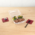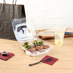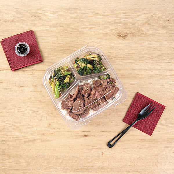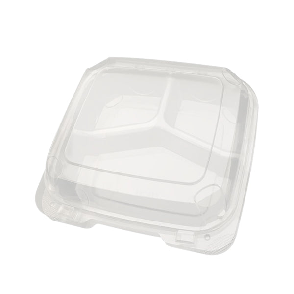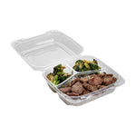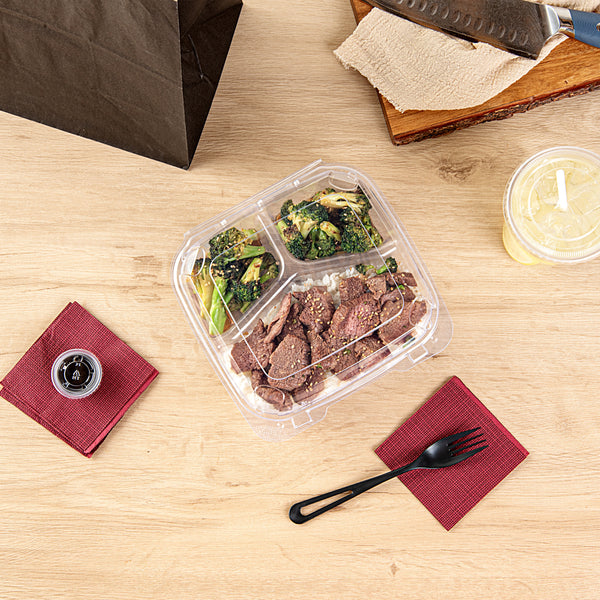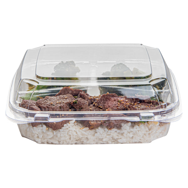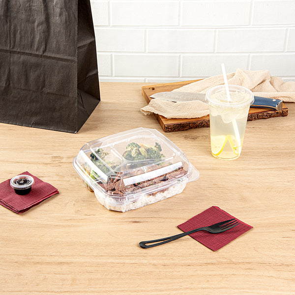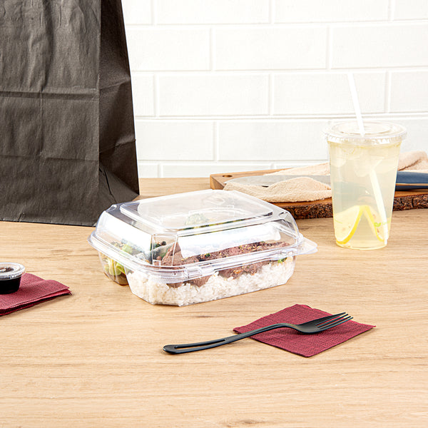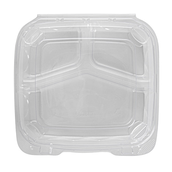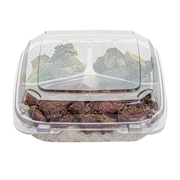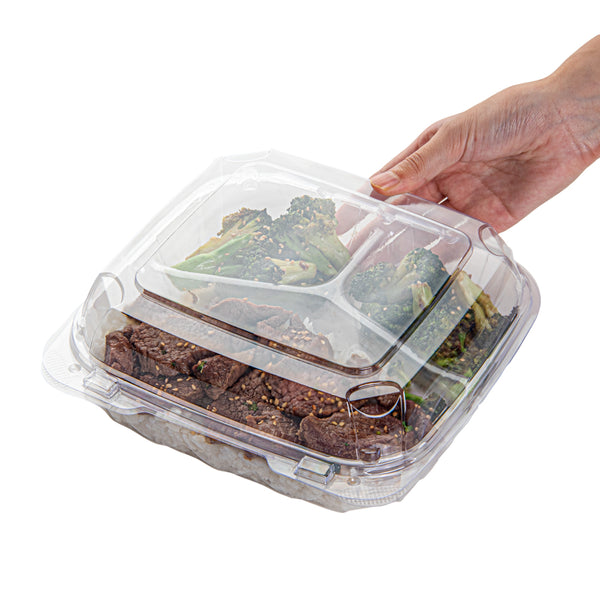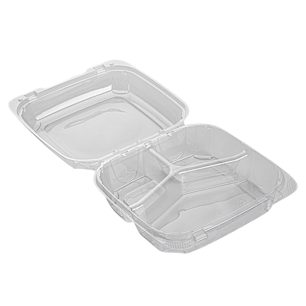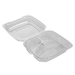 Use our Thermo Tek 34-ounce Square Clear Plastic Clamshell Containers to contain and preserve the freshness of delivery or take out meals. With an anti-fog design, these clamshell containers offer full visibility of dishes by preventing condensation build-up. Constructed with a 3-compartment layout, these plastic food containers are ideal for separating entrees from sides. These square food containers have attached clamshell lids to easily protect food during delivery or carry out. Featuring a crystal clear finish, these clamshell food containers provide a complete view of meals without having to sacrifice presentation. To store prepped dishes without a hassle, these plastic food containers are freezable. These to go food containers are made from durable PET plastic to effortlessly carry an array of appetizers, saucy entrees, or hefty desserts. For an environmentally sustainable option, these take out food containers are recyclable. These clamshell containers measure 7.75 inches in length by 2.5 inches in height and can hold up to 34 ounces. Sold in a 100 count box.