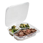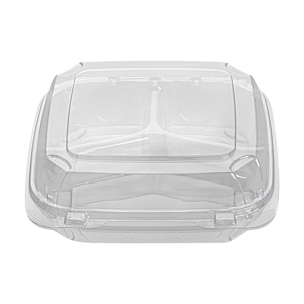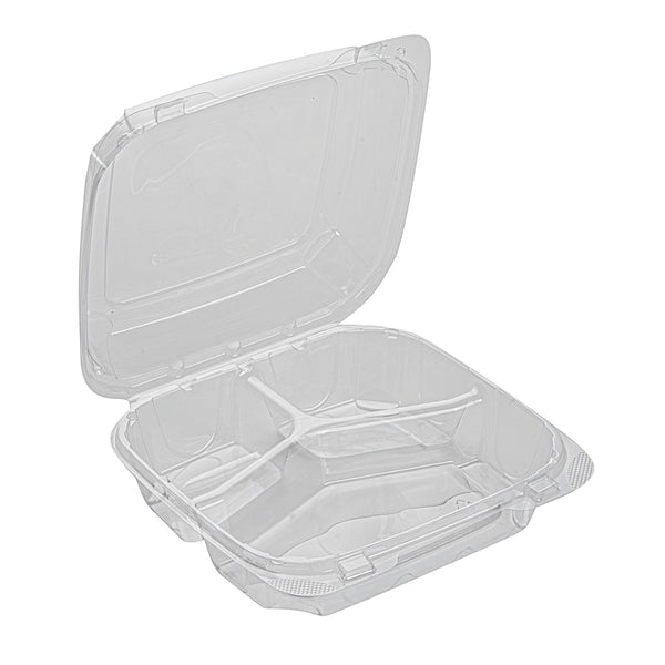 34 OZ PLASTIC CLAMSHELL CONTAINER - 3-COMPARTMENT, ANTI-FOG