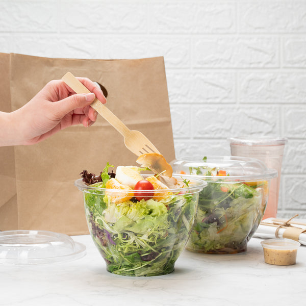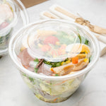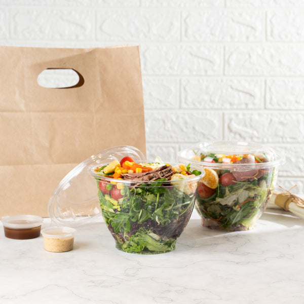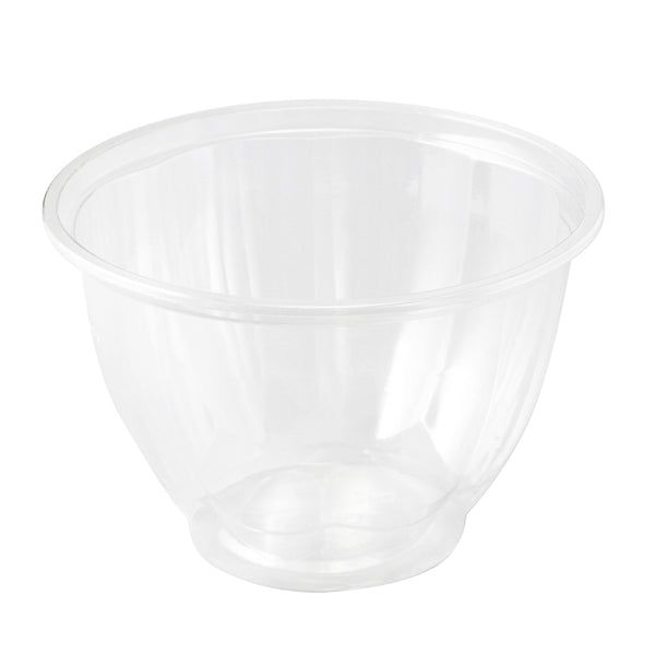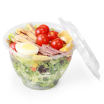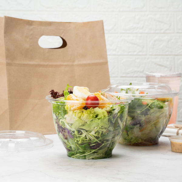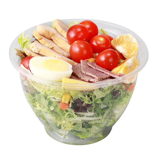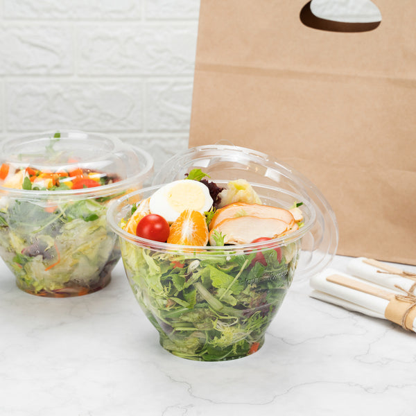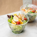 Offer customers meals using our Thermo Tek 48-ounce Clear Plastic Ergo-Grip Bowls. Featuring a strong and sturdy plastic construction, these crack-resistant bowls are built to contain hefty salads, pasta, vegetables, and other foods without bending or breaking. These large plastic bowls have a clear finish that brilliantly showcases the freshness and vibrant colors of dishes to attract the attention of guests. Pair these take out bowls with our coordinating flat lids (SKU: RWP0591C) to keep meals intact during transport. These clear food bowls are conveniently disposable and recyclable to shorten the cleaning process in an eco-friendly way at your catered event, food truck, or restaurant. Containing up to 48 ounces, these stackable bowls measure 6.75 inches in diameter by 4.25 inches in height. Shipped in a 50 count box. Clear lids are available and sold separately.