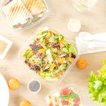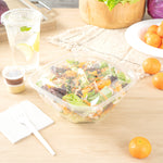 Have customers take their orders to go with our Thermo Tek 51-ounce Square Clear Plastic Take Out Salad Bowls. Featuring an anti-fog design, these food take out containers won't fog up to keep clear for easy identification. The hinged lid of these disposable plastic containers keeps your fare securely contained. Designed with a clamshell shape, these restaurant take out containers create extra space, so you can fill them up with food. Great for storing fare overnight, these clamshell to go containers are freezable. Constructed from premium PET plastic, these clear take out containers are strong and sturdy for holding multiple snacks. To shorten your cleaning process, these disposable clamshell containers are recyclable. These take out containers measure 7.5 inches long by 4.25 inches tall and contain up to 51 ounces. Sold in a 100 count box.