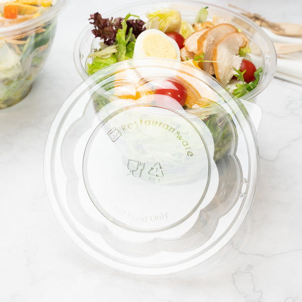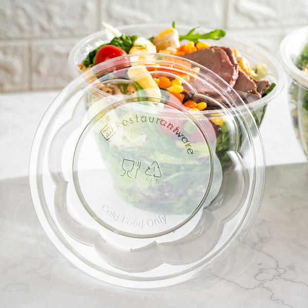 Securely seal meals for take out and delivery services with our Thermo Tek Clear Plastic Ergo-Grip Bowl Lids. These bowl lids have a clear finish that showcases meals and allows employees to quickly distinguish food orders. Crafted from durable plastic, these clear bowl lids are built to be crack-resistant and excellent for transporting meals to customers without messy accidents. Pair our plastic bowls with lids to lock in the freshness of to go orders (SKU: RWP0588C-50, RWP0589C-50, and RWP0590C-50). These eco-friendly lids are recyclable to speed up the end-of-day cleaning process at your fast-casual restaurant, diner, catered event, or other foodservice establishments. Measuring 6.7 inches in diameter, these lids are stackable for quick and simple storage in your storage room or commercial kitchen. Shipped in a 50 count box. Plastic bowls are available and sold separately.