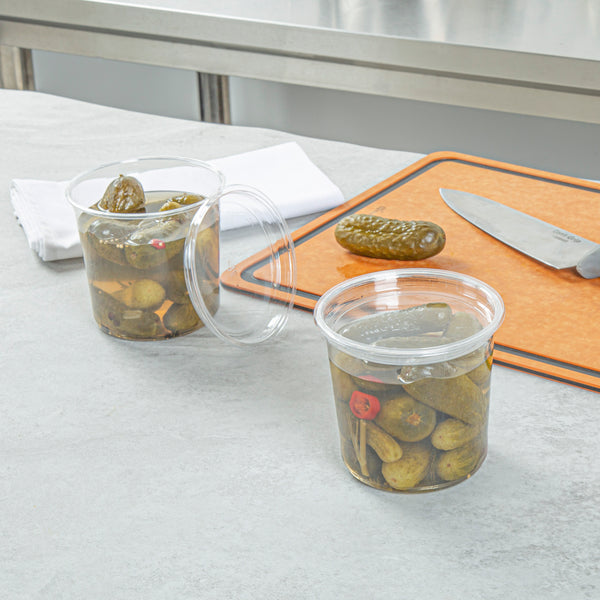 Ensure safe and spill-free takeout with our innovative deli container lid. The Thermo Tek Leak-Resistant Deli Container Lid, crafted from durable PET plastic, withstands the demands of high-volume catering and restaurant environments effortlessly. Designed to fit multiple container sizes, this versatile lid simplifies inventory management while enhancing operational efficiency. Its leak-resistant design guarantees that soups, salads, and other culinary creations remain fresh and secure during transport, reducing waste and improving customer satisfaction. With a convenient size of 4.65 inches in both length and width, this clear round lid for containers allows for excellent visibility, ensuring patrons can easily identify their orders. The BPA-free construction supports food safety initiatives, aligning with industry standards and customer expectations. Elevate your foodservice packaging with this reliable takeout bowl lid that meets the rigorous demands of professional kitchens. Each order includes 100 Thermo Tek Leak-Resistant Deli Container Lids.