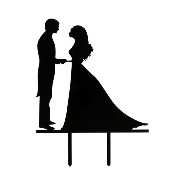 Get ready for the big day with our Top Cake Black Acrylic Silhouette Bride and Groom Cake Topper. Featuring the black silhouette of a bride and groom, this acrylic wedding cake topper is an excellent addition to any wedding cake. This bride and groom silhouette cake topper is made out of sturdy acrylic, making it easy to insert into your luxurious wedding cake and strong enough to stand perfectly still. Featuring a black silhouette finish, this wedding cake topper makes every cake it is added to, look romantic. Measuring 6.75 inches tall and 5 inches wide, this bride and groom silhouette cake topper is a must-have for all wedding cake decorations. Sold in a 1 count box.