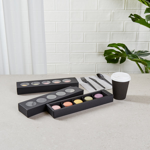 The rectangle design of these pastry boxes is designed to comfortably fit 5 macarons, making it the perfect choice for gift-giving or neatly organizing your tasty creations. Space-efficient and practical.