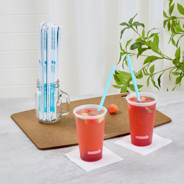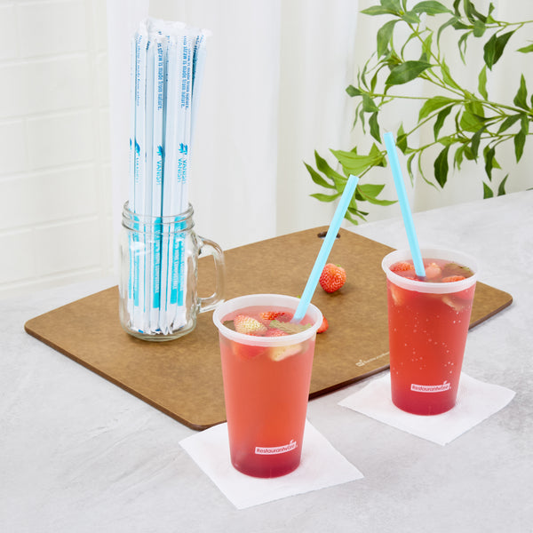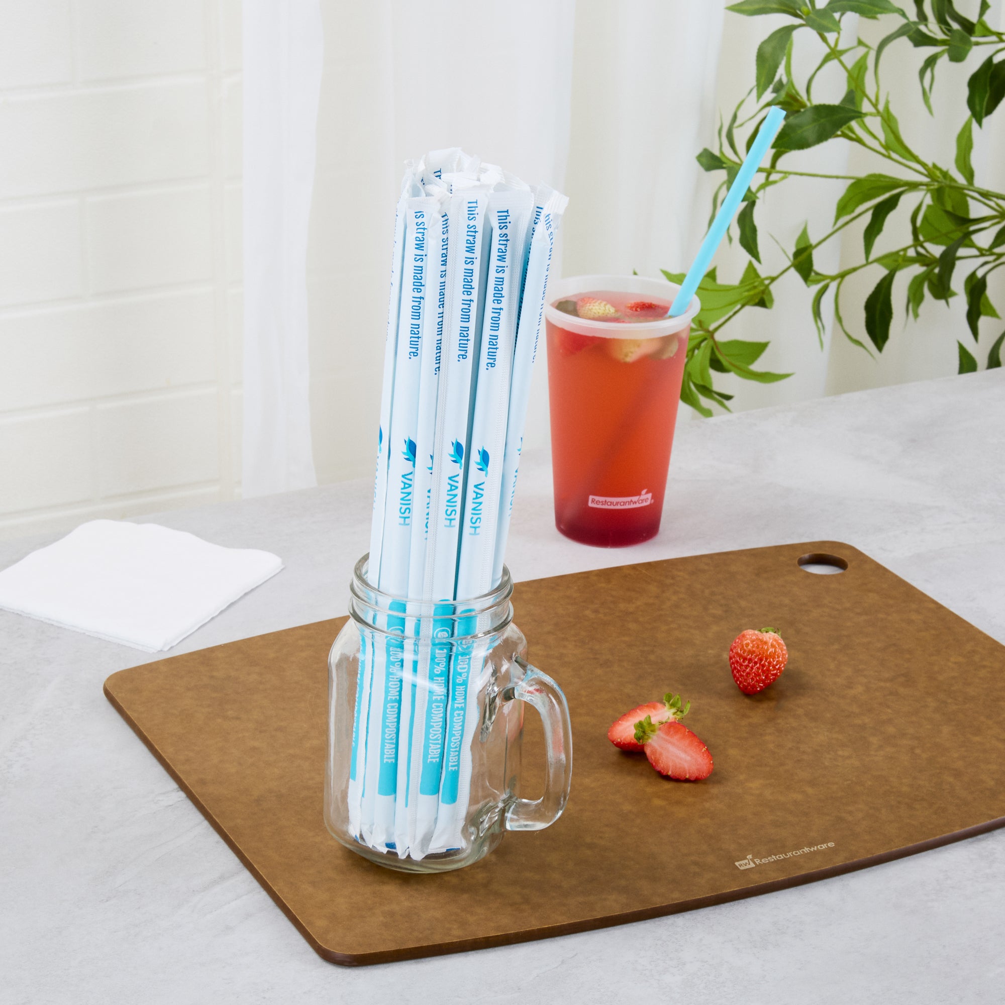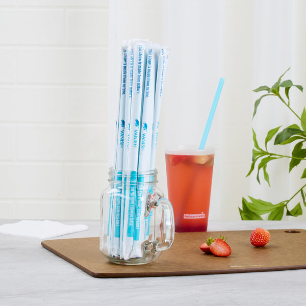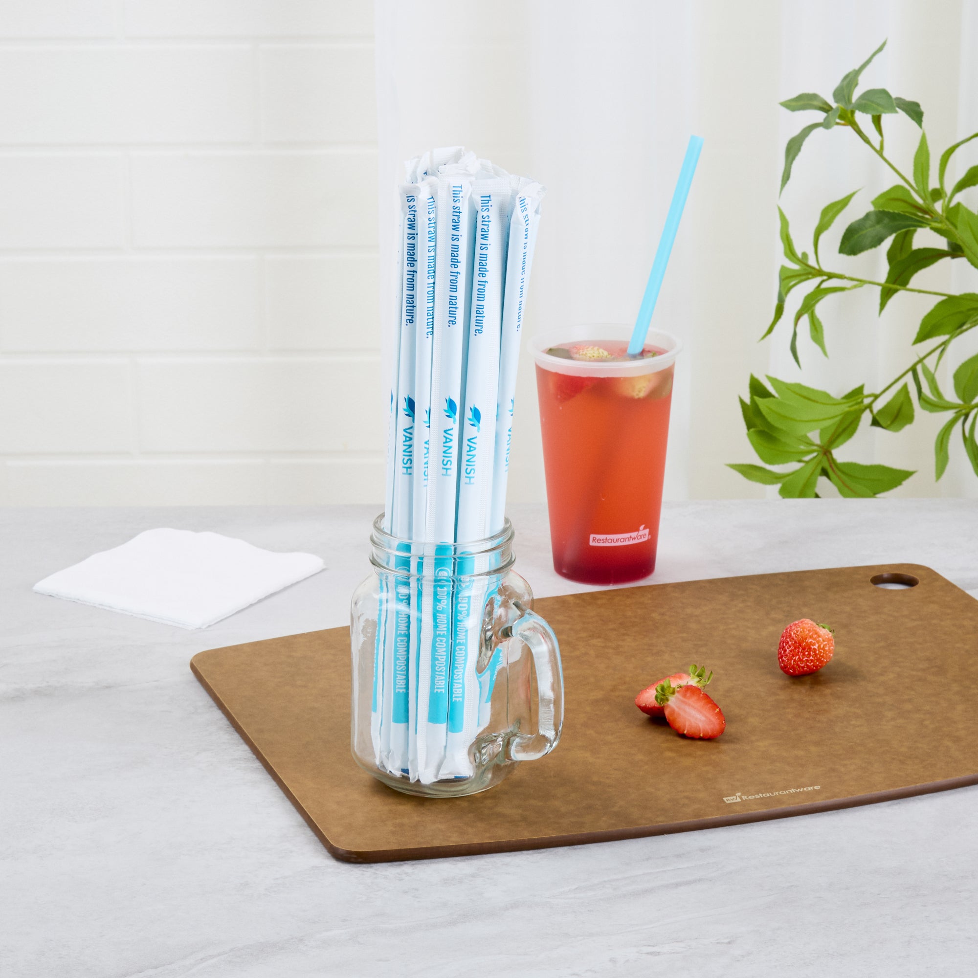 Ensure eco-friendly operations with compostable straws. The Vanish Home Compostable Smoothie Straws provide a sustainable alternative to traditional plastic, crafted from home compostable PHA plastic that supports your green initiatives. Each straw is wrapped for convenience, ensuring hygiene and protecting it from external contaminants, making it a perfect disposable straw for busy cafes and juice bars. With an 8 millimeter width, these smoothie straws are ideal for effortlessly sipping thick smoothies and shakes, enhancing customer satisfaction with every use. The vibrant blue color adds a pop of style to your beverage presentation, while the 10.236-inch length accommodates even the tallest of cups. Elevate your drink service by choosing these biodegradable and recyclable straws that are cold food friendly, reinforcing your commitment to sustainability. Each order includes 100 Vanish Home Compostable Smoothie Straws.