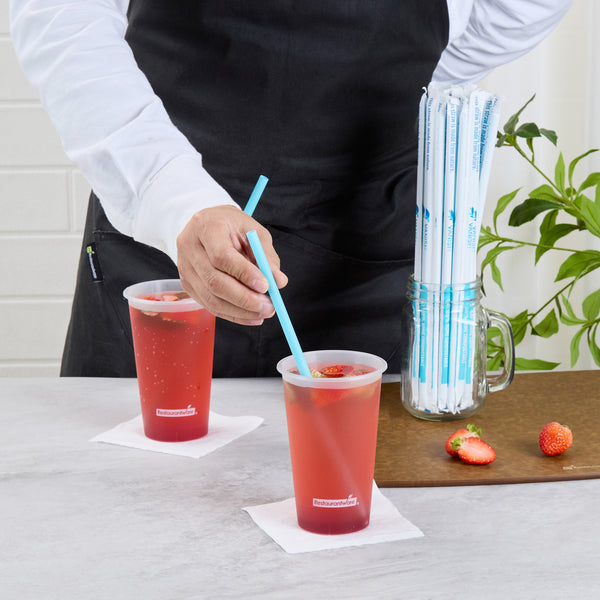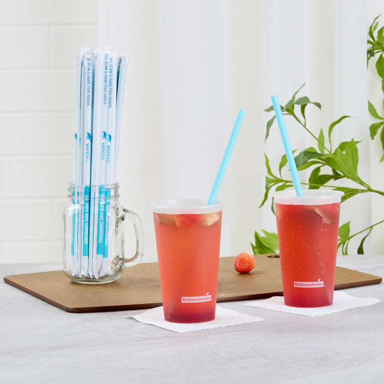 Ensure eco-friendly operations with compostable straws. The Vanish Home Compostable Smoothie Straws provide a sustainable alternative to traditional plastic, crafted from home compostable PHA plastic that supports your green initiatives. Each straw is wrapped for convenience, ensuring hygiene and protecting it from external contaminants, making it a perfect disposable straw for busy cafes and juice bars. With an 8 millimeter width, these smoothie straws are ideal for effortlessly sipping thick smoothies and shakes, enhancing customer satisfaction with every use. The vibrant blue color adds a pop of style to your beverage presentation, while the 10.236-inch length accommodates even the tallest of cups. Elevate your drink service by choosing these biodegradable and recyclable straws that are cold food friendly, reinforcing your commitment to sustainability. Each order includes 1000 Vanish Home Compostable Smoothie Straws.