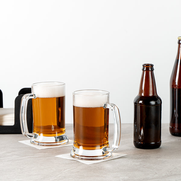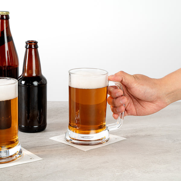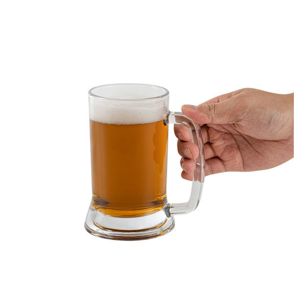 Elevate your bar's drinkware selection with our Vetri 16-ounce Beer Mug Glasses. The smooth rim of these beer mugs provides a comfortable sipping experience, enhancing the overall enjoyment for your patrons. Plus, the clear glass design of these beverage mugs allows your customers to appreciate the vibrant colors and bubbles of their beer, adding an extra touch of sophistication. Featuring a wide base, these beer glasses remain upright throughout the bustling night at your bar or pub. With an easy-to-grip handle, these pint beer glasses ensure convenient serving and transport. Crafted from durable, lead-free soda lime glass, these glass beer mugs withstand regular use while maintaining their pristine appearance. For easy maintenance, these party mugs are dishwashable, making cleanup a breeze. With a capacity of 16 ounces, these beverage glasses measure 3.23 inches in diameter by 5.67 inches in height. Sold in a 24 count box.