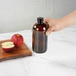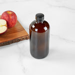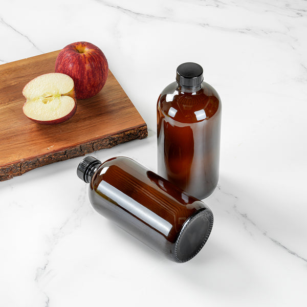 16 OZ BOSTON ROUND AMBER GLASS BOTTLE - WITH BLACK PHENOLIC CAP