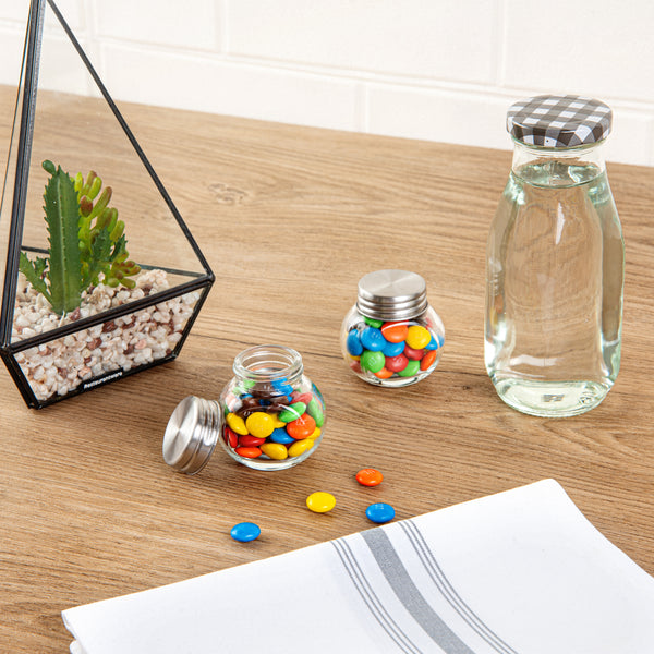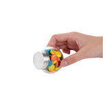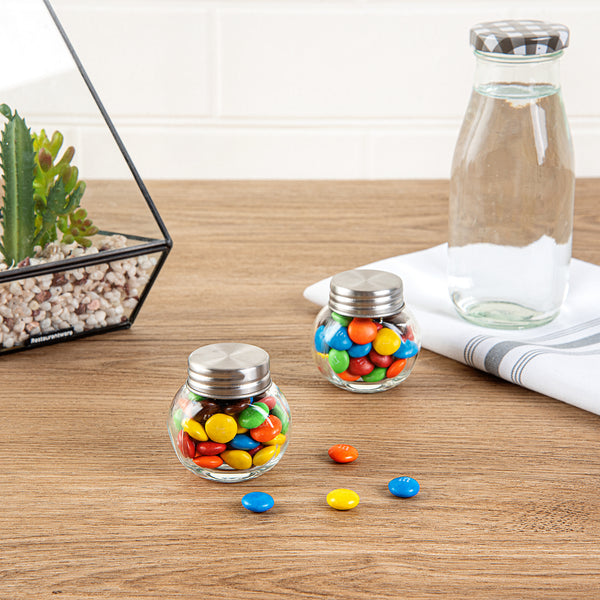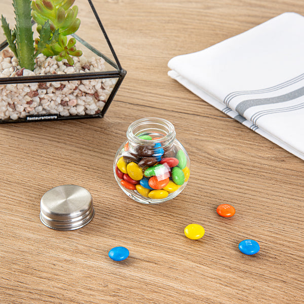 Elevate your event with our Vetri 2-ounce Glass Mini Favor Jar. Designed for durability, each favor jar features a resilient chrome lid that ensures the security of your treasured contents. The wide-opening spout of these clear treat jars provides effortless access, simplifying filling and pouring tasks. These clear glass mini favor jars not only add a touch of sophistication to any occasion but also offer a glimpse of the delights they hold, making them a charming addition to your event decor. Cleanup becomes a breeze as these glass candy jars are conveniently dishwashable. With a generous capacity of 2 ounces, they provide ample room for your imaginative creations. Measuring 2.17 inches in length by 1.5 inches in width by 2.17 inches in height, these party favor jars are perfectly sized for elegantly showcasing your treats. Sold in a 10 count box.