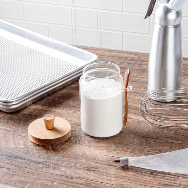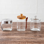 Maintain your kitchen looking neat and polished using our Vetri 29-ounce Glass Storage Jar. This glass food storage container is made from high-quality glass to efficiently store hot or cold ingredients. To open and close with comfort, this glass container with lid features an acacia lid with knob handle provides an easy grip. With a glass hole on the side, this glass storage jar allows you to easily store the included spoon for quick and simple food prep. This storage jar with lid has an airtight seal to preserve the freshness of its contents. To avoid excess scrubbing, this glass food jar is effortlessly dishwashable. Featuring a clear glass finish, this glass container for kitchen gives you full access to see what's inside. This glass storage jar with lid has a 29-ounce capacity and measures 3.25 inches in length by 3.25 inches in width by 7.5 inches in height. Sold in a 1 count box.
