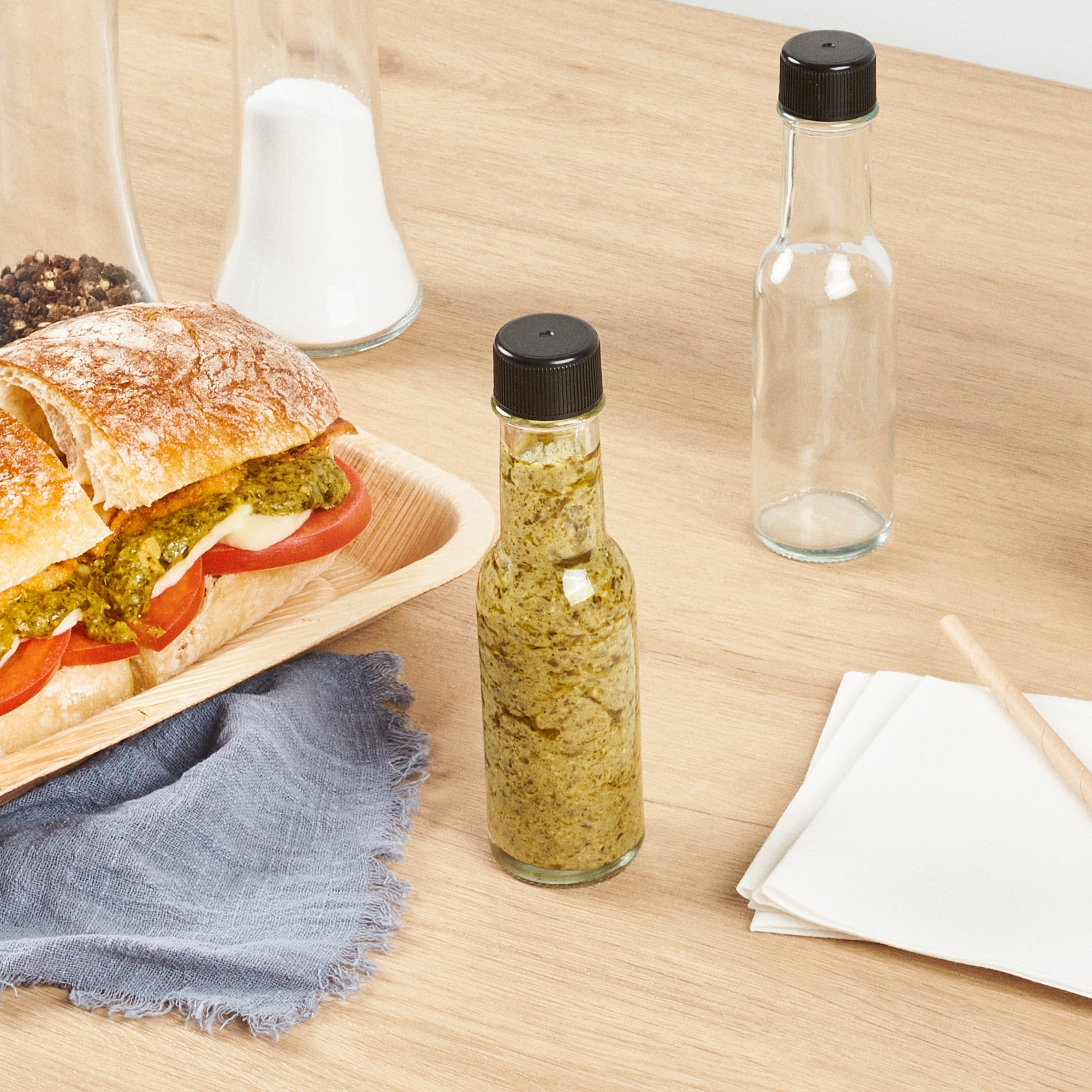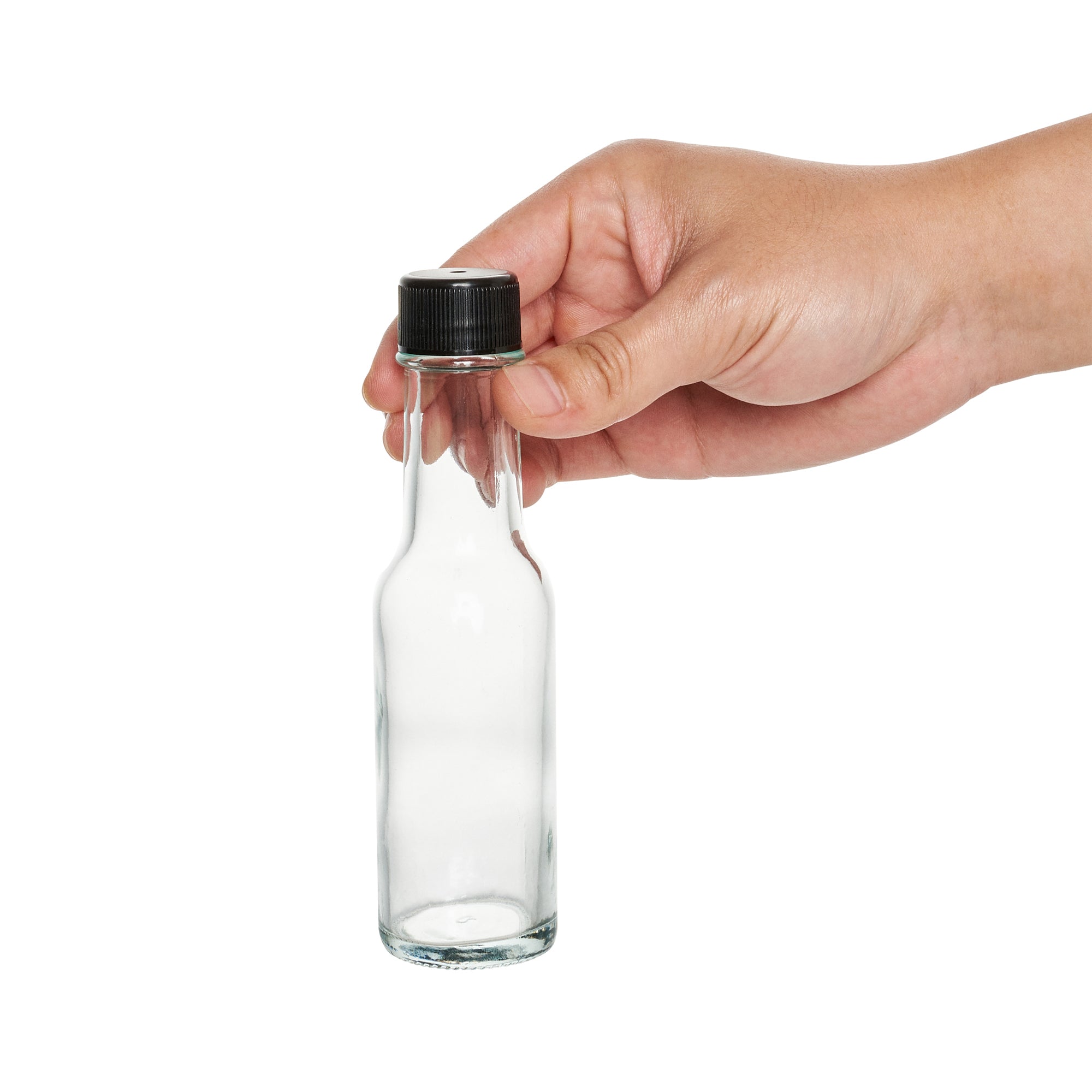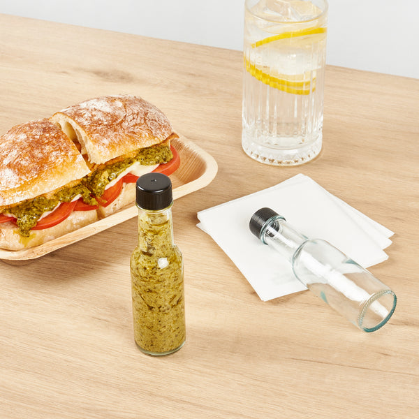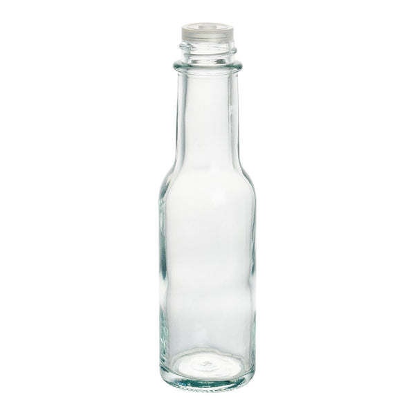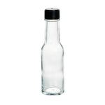 Elevate your food presentation with our Vetri 3-ounce Glass Woozy Bottles. These glass sauce bottles come with black caps that form a secure seal, keeping your contents protected and fresh. Featuring a simple, classic design, these hot sauce bottles will complement the rich colors and textures of the sauces or dressings they contain. Designed with a traditional long neck and wide base, these small glass bottles are perfect for easy pouring and transporting. The crystal-clear finish of these glass bottles ensures great visibility, making them ideal for display. Crafted from durable lead-free soda lime glass, these sauce bottles withstand regular use while maintaining their pristine appearance. These clear glass bottles are dishwasher-safe and facilitate an easy cleaning experience. With a capacity of 3 ounces, these glass bottles measure 1.58 inches in length by 1.58 inches in width by 5.91 inches in height, making them ideal for a variety of culinary needs. Sold in a 10 count box.