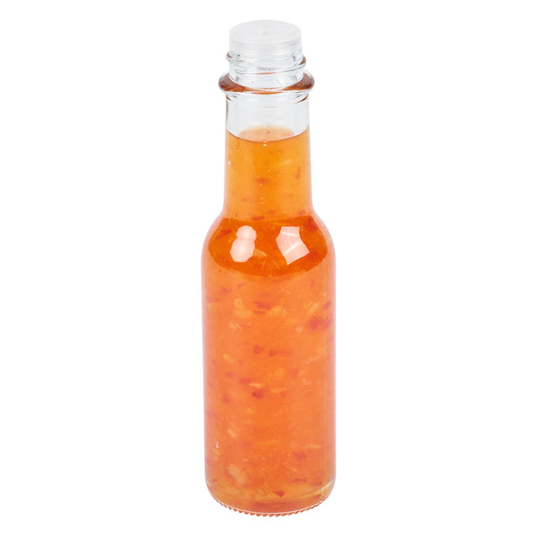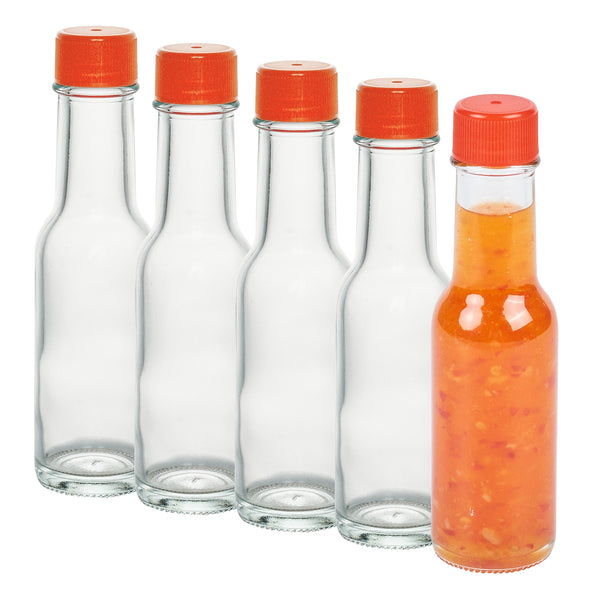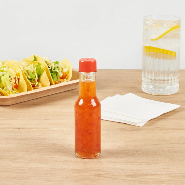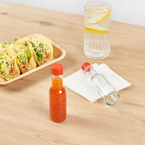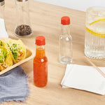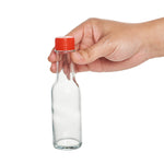 Enhance your food presentation with our Vetri 3-ounce Glass Woozy Bottles, ideal for showcasing sauces and dressings. These glass sauce bottles come with red caps that form a secure seal, keeping your contents protected. Featuring a traditional long neck and wide base, these glass bottles are perfect for pouring and transporting your culinary creations. The crystal-clear finish of these small glass bottles allows for excellent visibility of the contents, making them perfect for display. Crafted from durable lead-free soda lime glass, these sauce bottles withstand regular use while maintaining their pristine appearance. These hot sauce bottles are dishwasher-safe and facilitate a straightforward cleaning experience. With a capacity of 3 ounces, these clear glass bottles measure 1.58 inches in length by 1.58 inches in width by 5.91 inches in height. Sold in a 10 count box.
