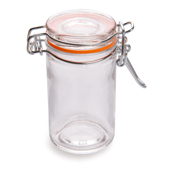 Delightfully store spices with our Vetri Nostalgic Clamp Lid Glass Mason Jars. Crafted from premium glass, these durable small glass containers are conveniently dishwasher-safe and scratch-resistant. Featuring an airtight clamp lid, these versatile small jars secure your high-quality condiments and keep air and moisture out. Plus, they prevent unsightly messes at your cafe, bistro, restaurant, and more! Containing up to 3.4 ounces, use these small jars with lids to charmingly store granulated brown sugar at your cafe, or to stylishly serve sweet apple butter at your restaurant. These 3.4-oz glass containers with lids measure 1.7 inches long by 3.3 inches tall and ship in a 10 count box.