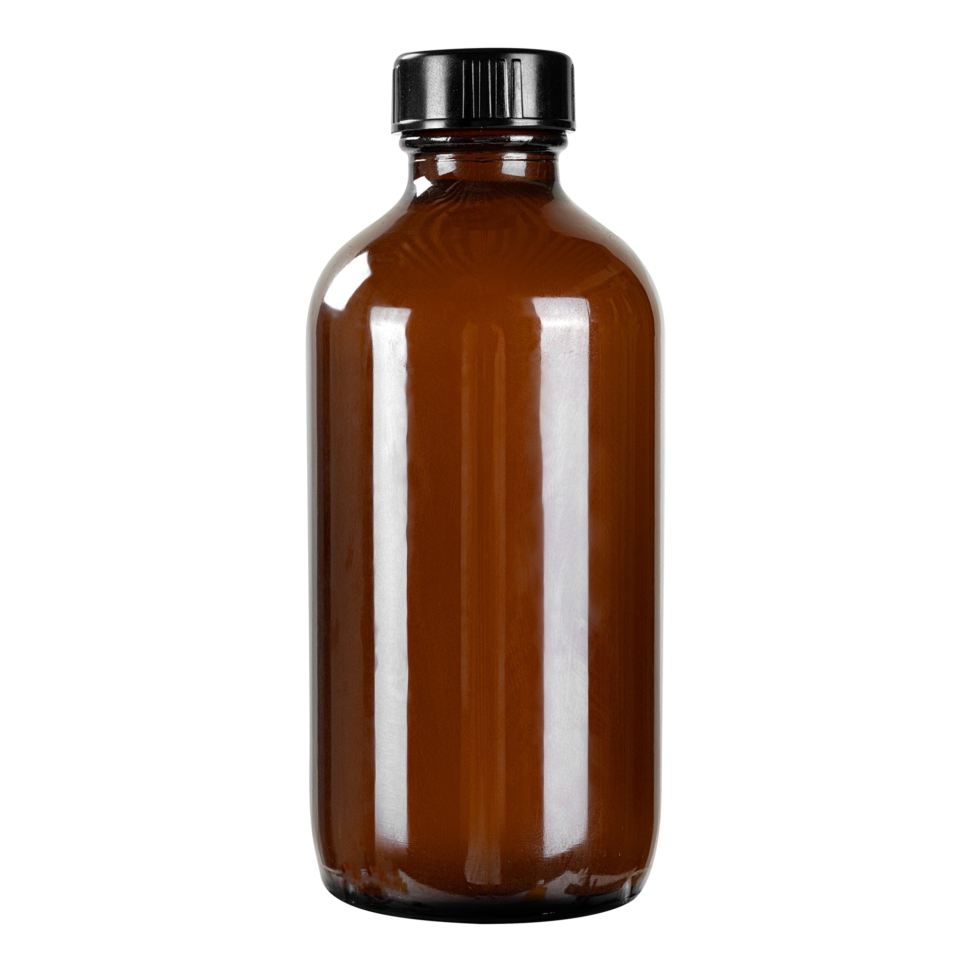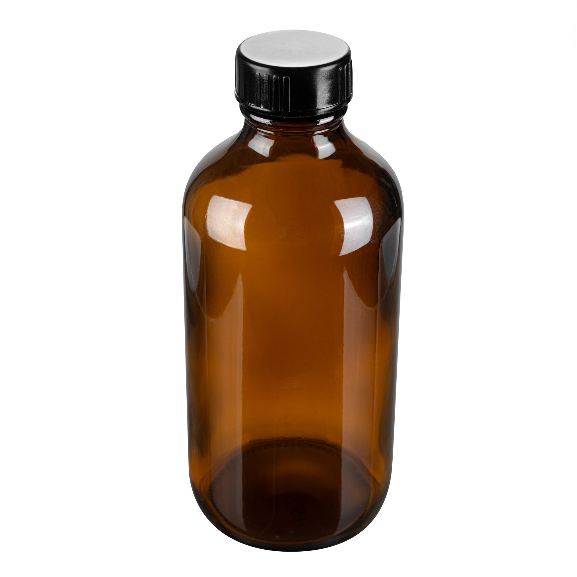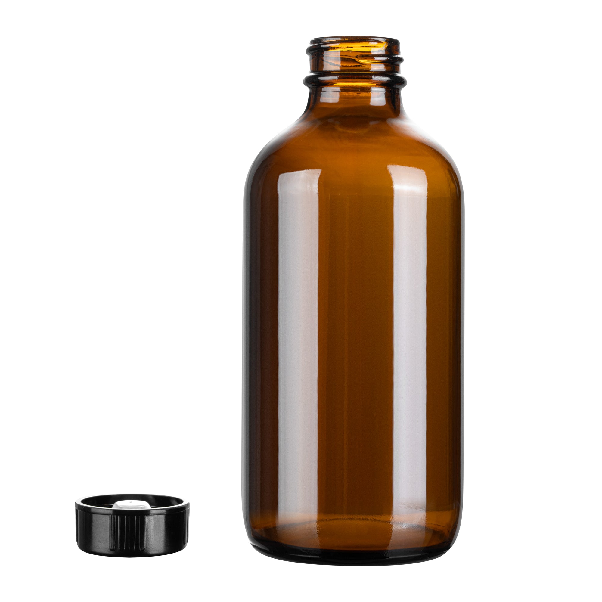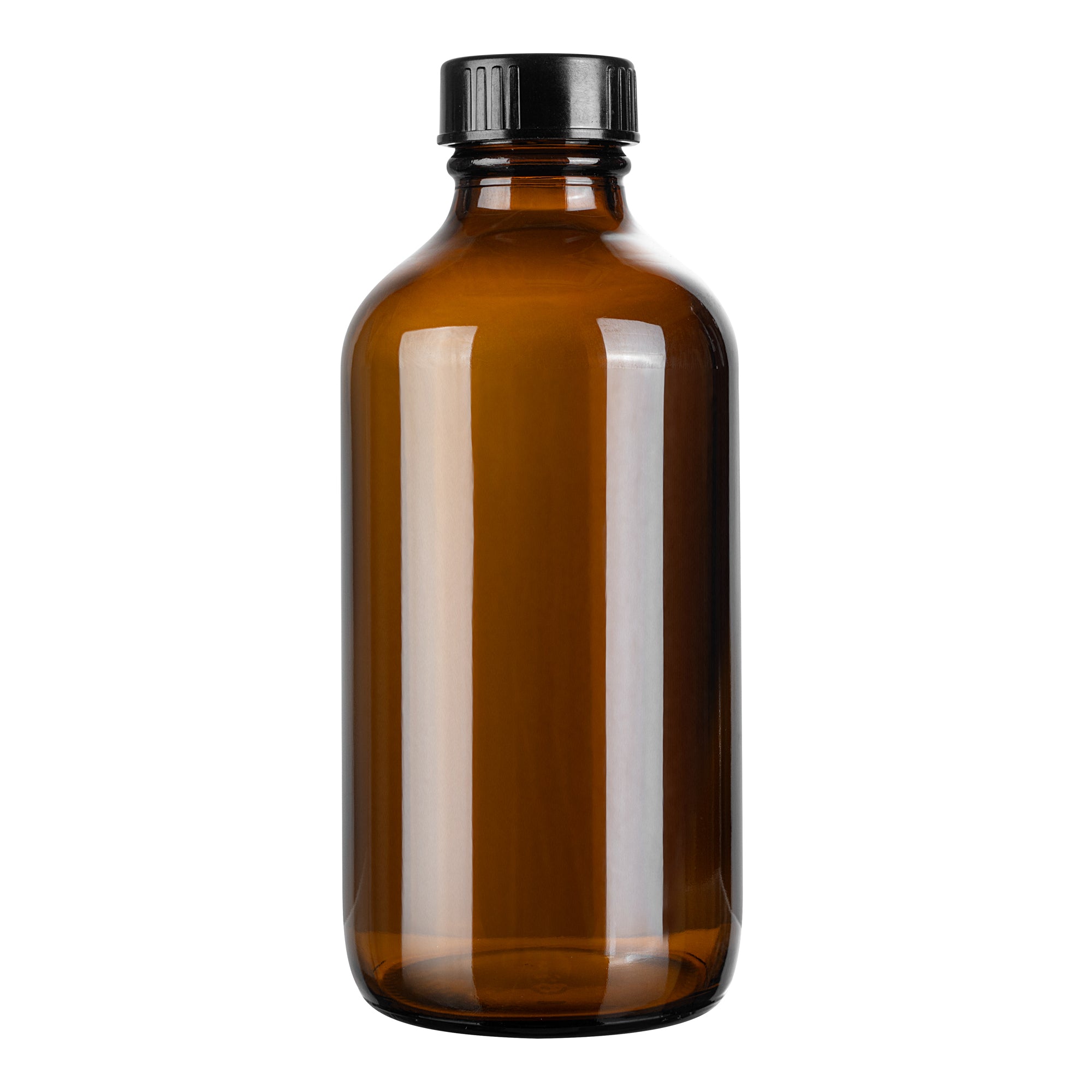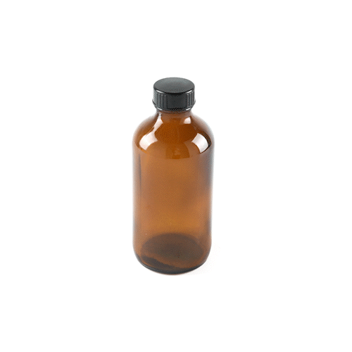 8 OZ BOSTON ROUND AMBER GLASS BOTTLE - WITH BLACK PHENOLIC CAP