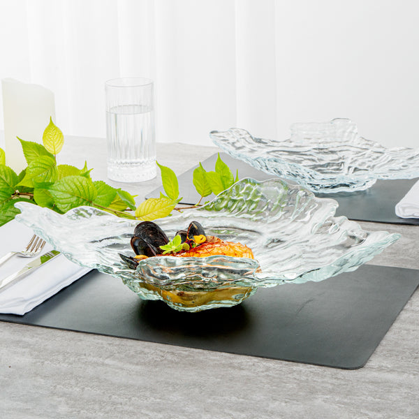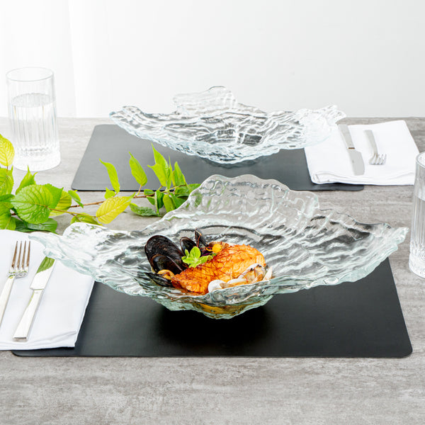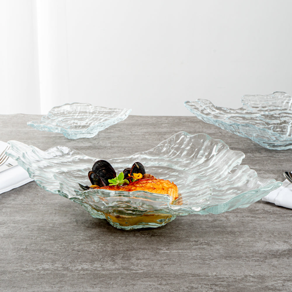 Add eye-catching tableware to your food presentation with our Vetri Abstract Clear Glass Seashell Serving Plate. Featuring a robust and durable construction made from premium soda glass, this seashell serving dish is durable and long-lasting. Plus, this serving glass plate withstands temperatures up to 140F and is suitable for presenting hot and cold foods like cold salads or hot brownies. With an intricate seashell patterned texture on the bottom, this decorative glass plate enhances food presentation. With a lead-free material construction, this vintage glass serving plate won't leach undesirable substances into food. The raised edges of this antique glass plate avoid accidental food spillage. To streamline the cleaning process, these designer glass serving plates are conveniently dishwashable. Measuring 18 inches in length by 13.5 inches in width by 3.75 inches in height, this glass seashell serving dish is ideal for presenting any dish. Shipped in a 1 count box.