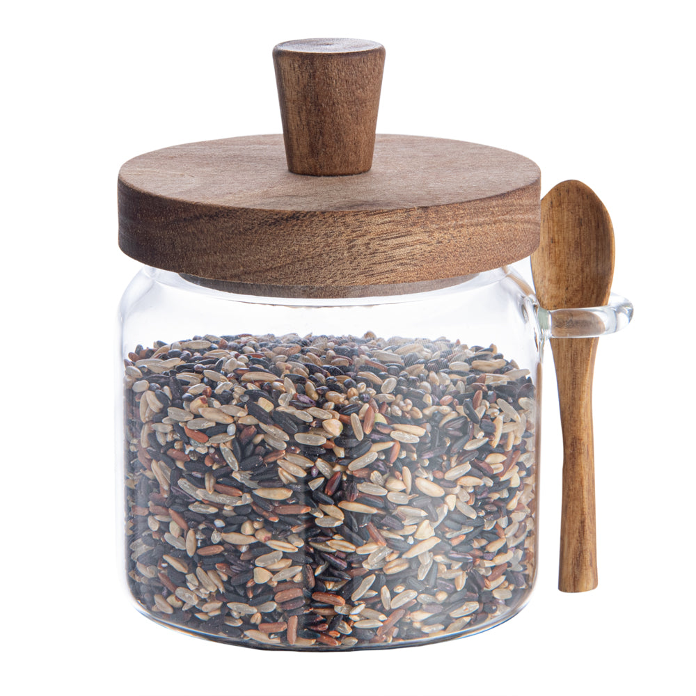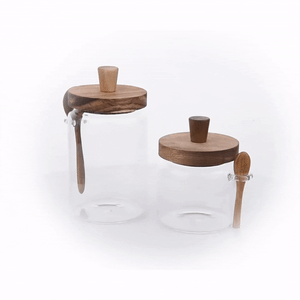 GLASS 2-PIECE STORAGE JAR SET - 17 AND 27 OZ, WITH ACACIA LID, SPOON