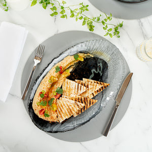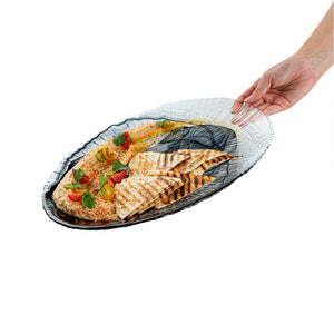 Elevate your patron's plating experience with our Vetri Oval Black Glass Focus Serving Plates. Made from premium soda-lime glass, these leaf serving plates are durable and long-lasting. Designed to serve all kinds of food, these vintage glass serving plates withstand temperatures up to 140F and are hot and cold friendly. With their lead-free glass construction, these antique glass plates don't spread any undesirable substances into food. The slightly raised edges with the ripple texture of these black oval plates give a better holding grip and avoid accidental food spillage. With their dishwasher-safe design, these clear glass serving plates are easy to clean. Featuring a black and clear glossy fluid art finish, these antique glass serving dishes transude an elegant touch to your food presentation. Measuring 15 inches in length by 9.75 inches in width by 1.25 inches in height, these oval glass serving plates are perfect for serving roasted sardine, pan-seared steak, and chocolate roulade. Shipped in a 6 count box.