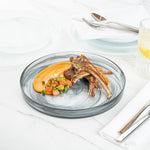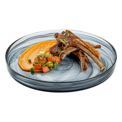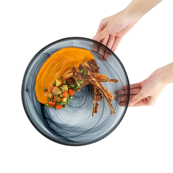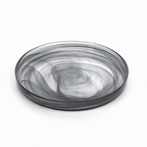 Beautifully present food on your dining table with our Vetri Round Black Glass Alabaster Plate. Manufactured with lead-free soda glass, this serving glass plate is durable and withstands rigorous use. With its opulent swirls of black color, this crystal serving dish is a sure head-turner for events. The smooth edges of this handmade decorative glass platter are slightly raised to prevent food from spilling out onto the table. Tolerating temperatures up to 140F, this antique glass serving dish is ideal for serving hot or cold meals. This reusable antique glass platter is dishwashable, making your post-meal cleaning hassle-free. Measuring 11 inches in diameter by 1.25 inches in height, these glass serving plates add an elegant look to your restaurant, banquet, or cafe table setting. Shipped in a 1 count box.