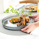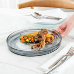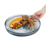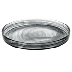 Beautifully present food on your dining table with our Vetri Round Black Glass Alabaster Plates. Manufactured with lead-free soda glass, these serving glass plates are durable and withstand rigorous use. With their opulent swirls of black color, these crystal serving dishes are a sure head-turner for events. The smooth edges of these handmade decorative glass platters are slightly raised to prevent food from spilling out onto the table. Withstanding temperatures up to 140F, these antique glass serving dishes are ideal for hot or cold meals. These reusable antique glass platters are dishwashable, making your post-meal cleaning hassle-free. Measuring 11 inches in diameter by 1.25 inches in height, these glass serving plates add an elegant look to your restaurant, banquet, or cafe table setting. Shipped in a 6 count box.