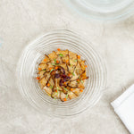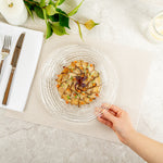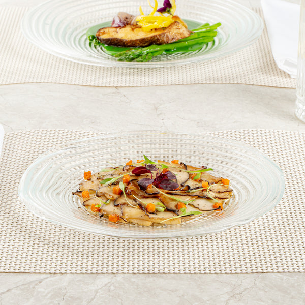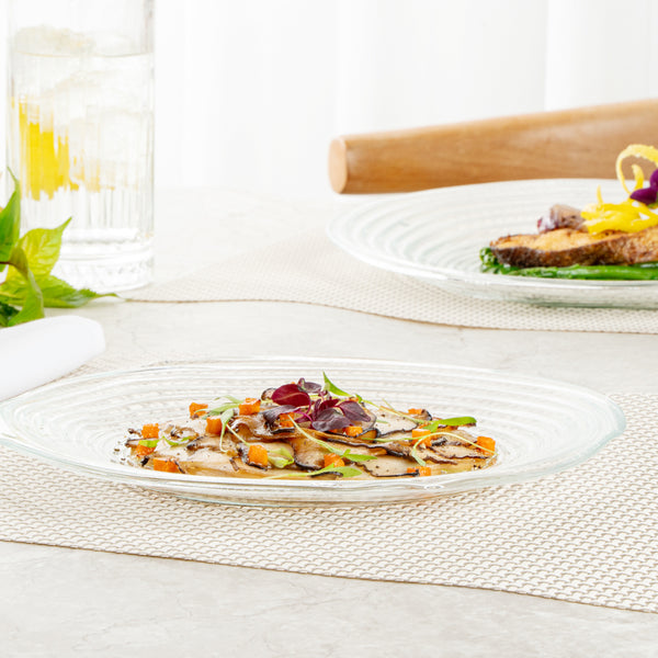 Dazzle your guests by presenting food in our Vetri Round Clear Glass Swirl Plates. Made of premium soda-lime glass, these serving glass plates do not react with your food. Designed with a swirl pattern on the surface, these round glass plates provide a stylish touch to foods and complement your table setting. With the ability to withstand high temperatures up to 140F, these decorative glass platters are dishwashable to save time and energy. Comfortably use these clear glass plates for hot snacks or cold desserts as they are hot or cold friendly. These antique glass platters do not contain lead to avoid the leaching of heavy metals into your food. Measuring 9.5 inches in diameter, these glass swirl serving dishes are great for serving all kinds of dishes. Shipped in a 6 count box.