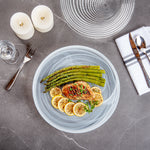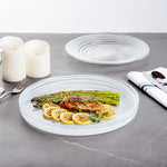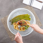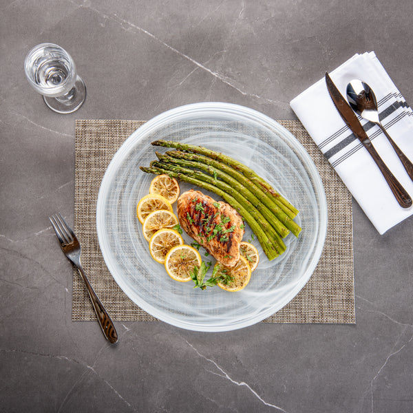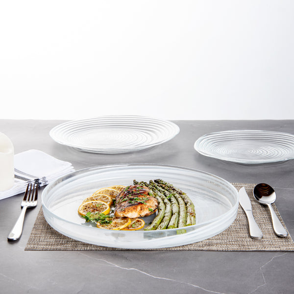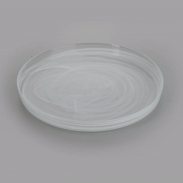Make your guests go in awe with your food presentations by using our Vetri Round White Glass Alabaster Plates. With a durable soda-lime glass construction, these round glass plates are made for rigorous use at your establishment. Suitable for serving both hot and cold foods, these glass serving plates withstand temperatures up to 140F, making them ideal for presenting cold salads and hot brownies alike. These antique glass plates are made from lead-free glass and do not spread unwanted substances into food. These clear serving plates are dishwasher-safe for simple cleaning. With its ink swirls, these white alabaster dinnerware will turn heads at your next event. Measuring 12.99 inches in diameter by 1.37 inches in height, these serving glass plates are perfect for serving pancakes, sandwiches, or lasagna to show off their layers easily. Shipped in a 6 count box.