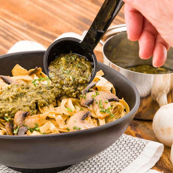 Serve gravy over turkey and mashed potatoes with our Voga 1-ounce Black Plastic Sauce Ladle. Featuring an angled design, this gravy ladle increases the distance between the sauce-filled bowl and employee uniforms to prevent unsightly stains. The built-in hook of this pizza sauce ladle can be placed on the rim of a pot so you can always keep it nearby while cooking. Featuring a deep bowl, this sauce ladle controls portion size and fills sauce cups without making a mess. Made from high-quality plastic, this small sauce ladle is dishwasher-safe for a fast and easy cleanup at your buffet, restaurant, or catering service. With a stylish black finish, this gravy ladle complements your serveware and dishware. This black ladle measures 8.5 inches in length and contains up to 1 ounce of dressings and sauces. Sold in a 1 count box.