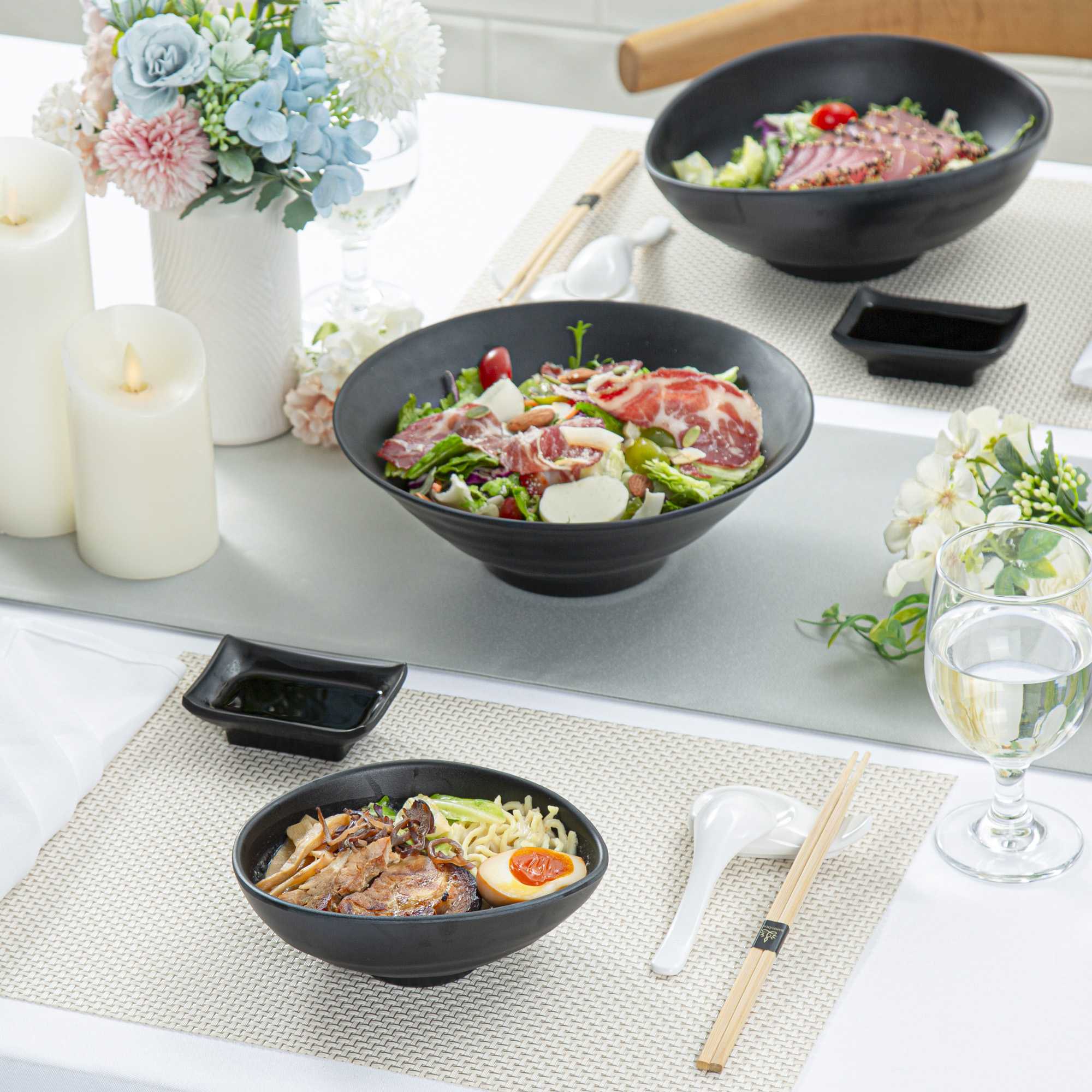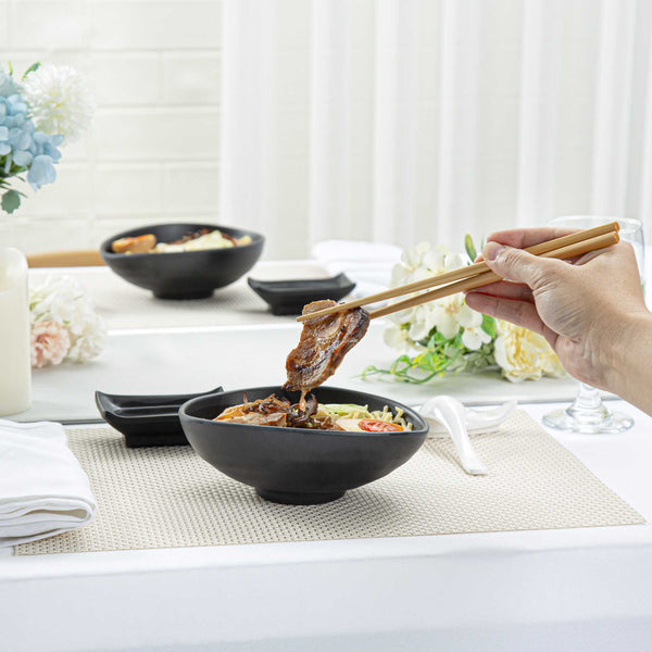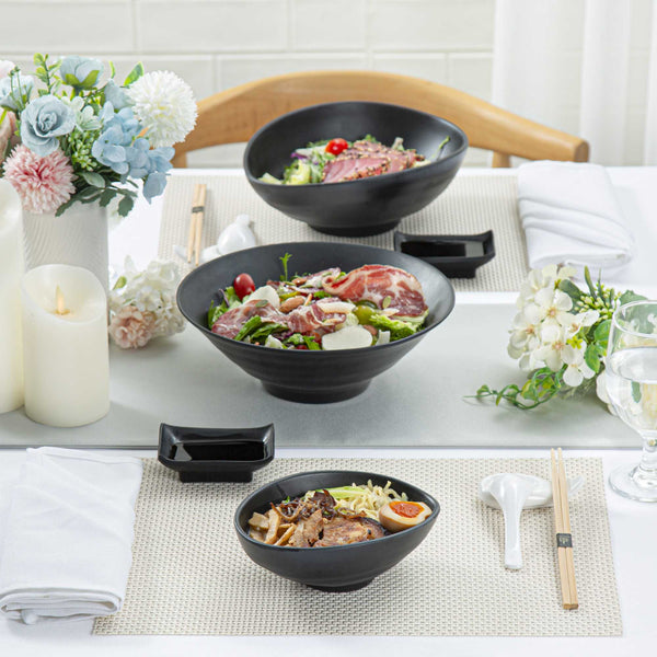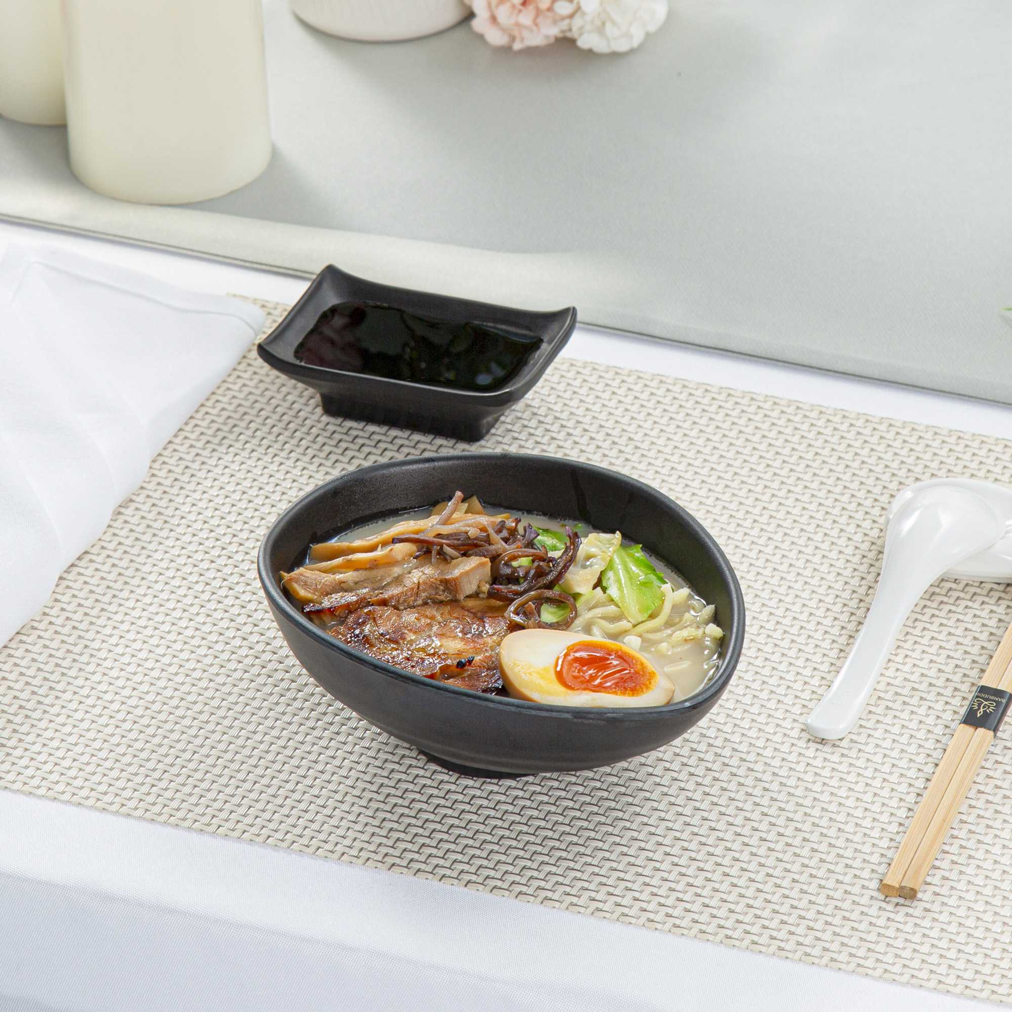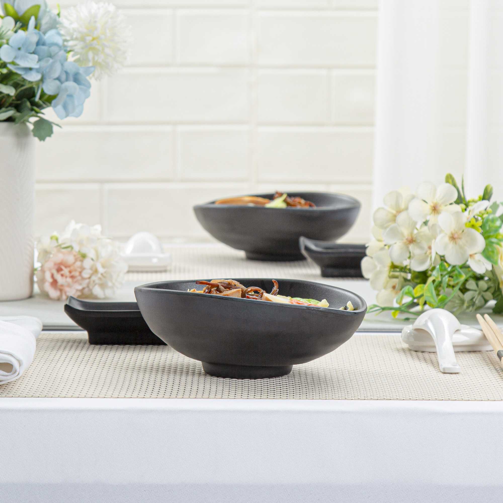 Serve appetizers with our Voga 15-ounce Round Black Melamine Freeform Small Bowls. Crafted from high-quality melamine, these serving bowls are durable and ideal for serving various hot or cold food items. These appetizer bowls mimic the look of a black stone, making them perfect for serving Asian-inspired fare at your parties or events. Featuring a unique elongated rim, these soup bowls beautifully frame the served food, enhancing their presentation. These melamine bowls hold up to 15 ounces and are perfect for displaying controlled portions of your signature dishes. For an easy cleanup, these catering bowls can be used in the top rack of a dishwasher. These black bowls measure 7 inches in length by 5.5 inches in width by 2.5 inches in height and have a capacity of 15 ounces. Sold in a 2 count box.
